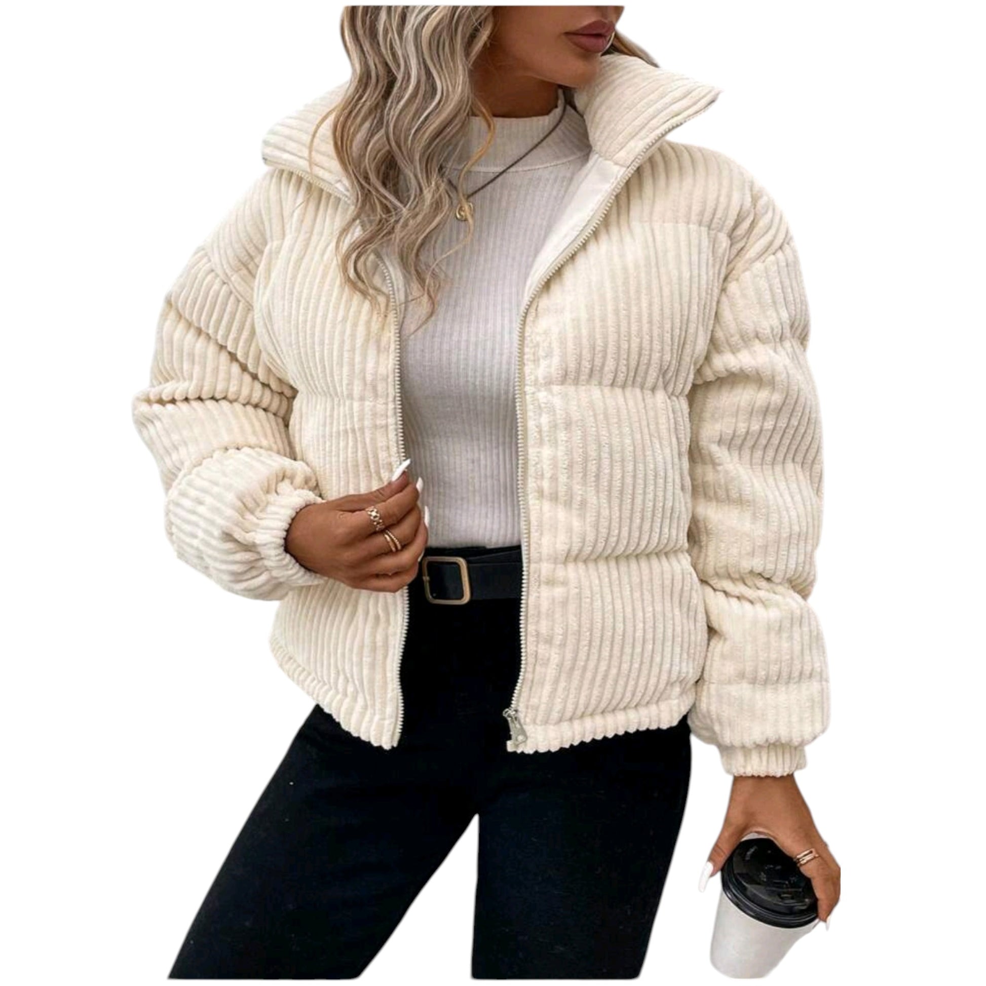 Címke nélküli, törtfehér, rövid, plüss, puha tapintású, cipzáras dzseki, magasított gallérral.