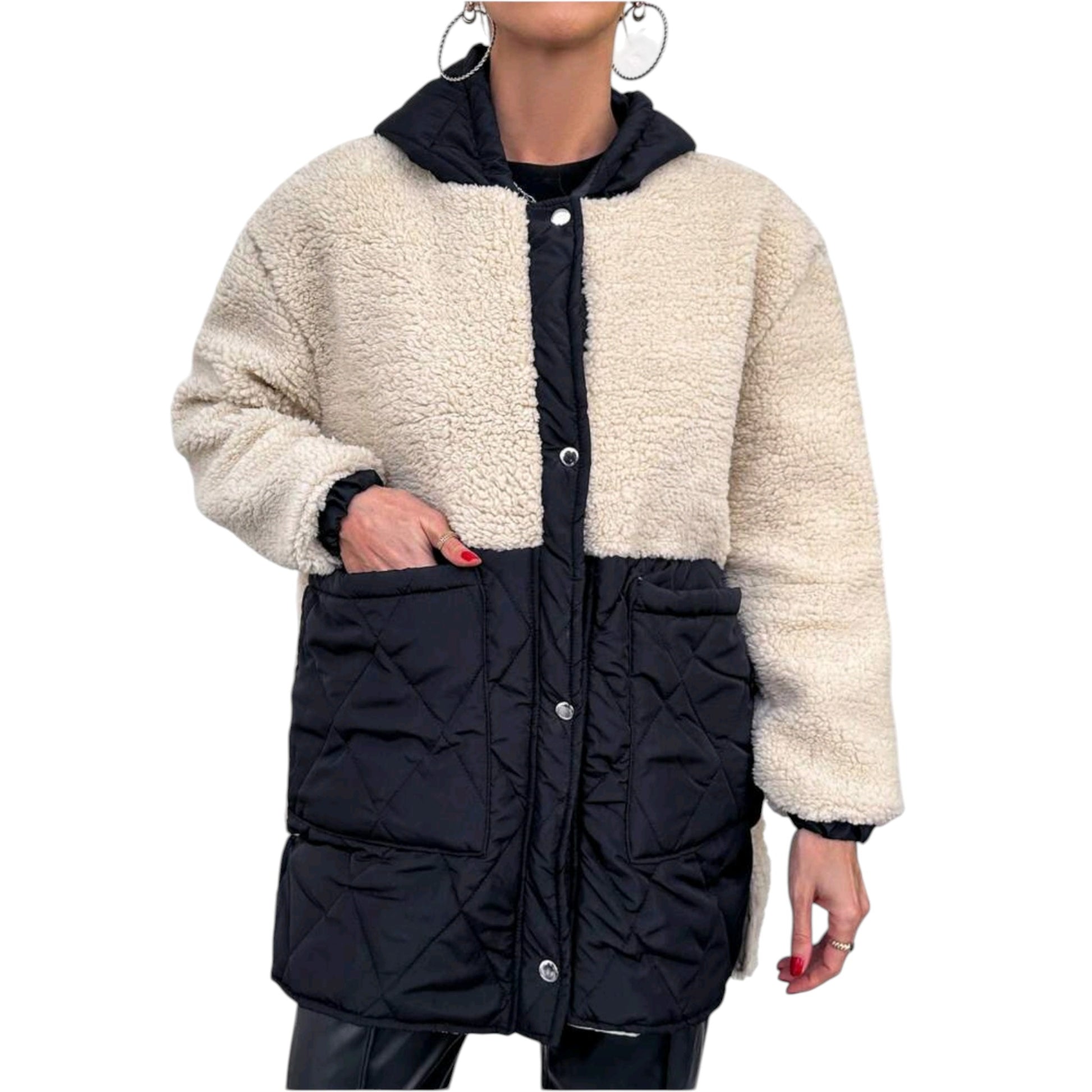 Címke nélküli, fekete/bézs, hosszú, plüss és steppelt betétes, gombos, puha tapintású kabát, kapucnival.