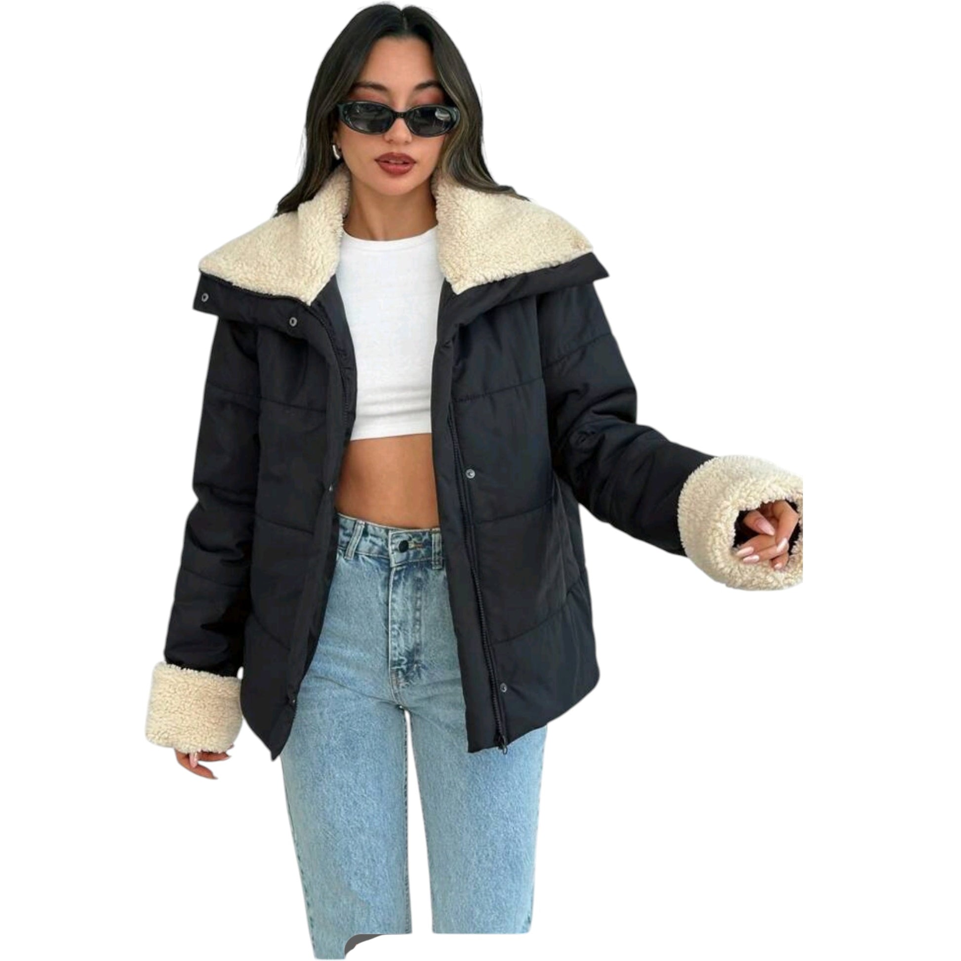 Címke nélküli, fekete, cipzáras, puha tapintású pufi dzseki, szőrmés gallérral és ujjvégekkel.