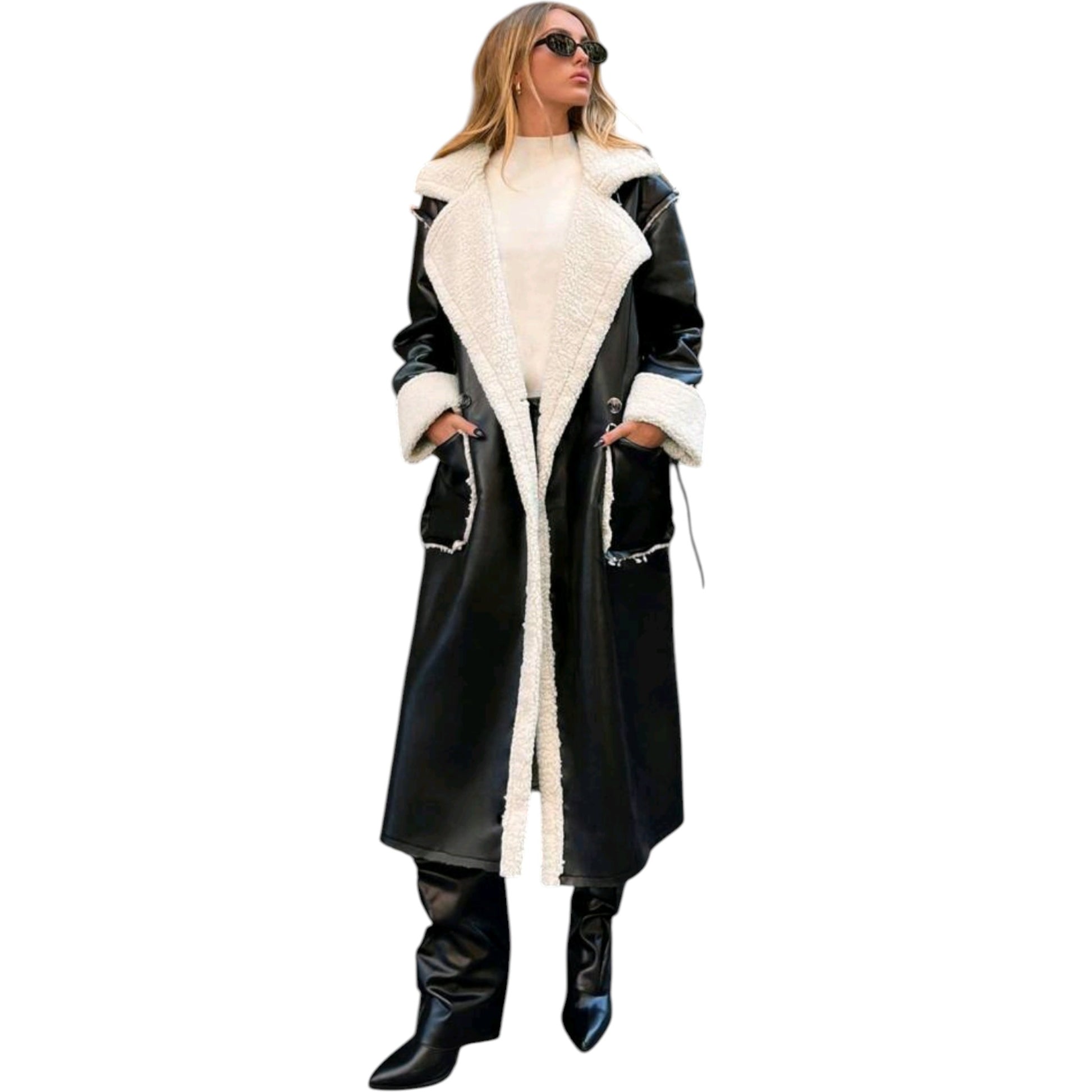 Címke nélküli, fekete, hosszú, bőrhatású kabát, fehér szőrmés béléssel.