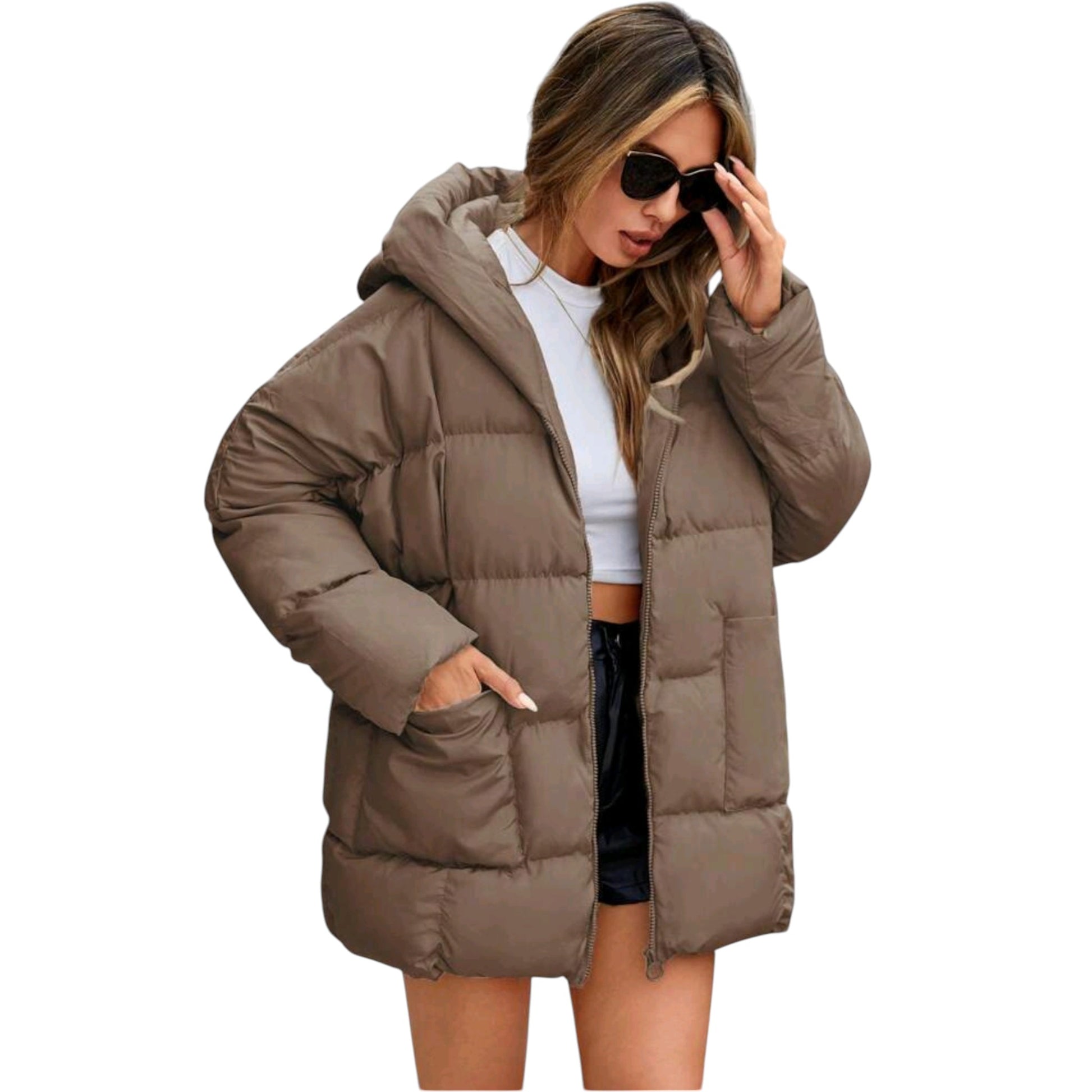 Címke nélküli, barna, hosszú, kapucnis, puha tapintású pufi dzseki.