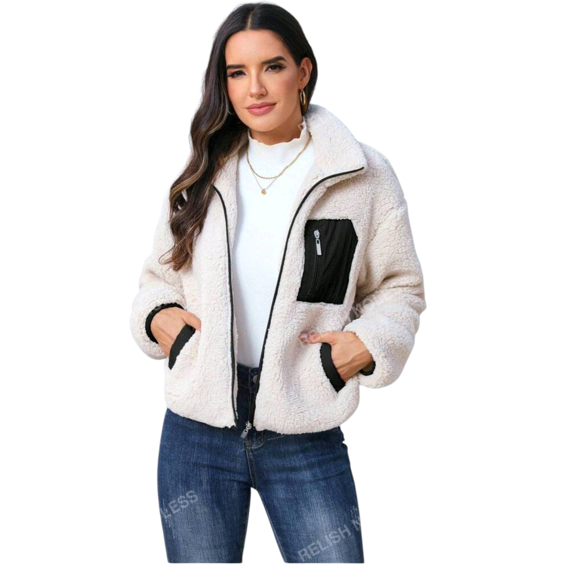 Címke nélküli, bézs, rövid, cipzáras, puha tapintású plüss dzseki, magasított gallérral.