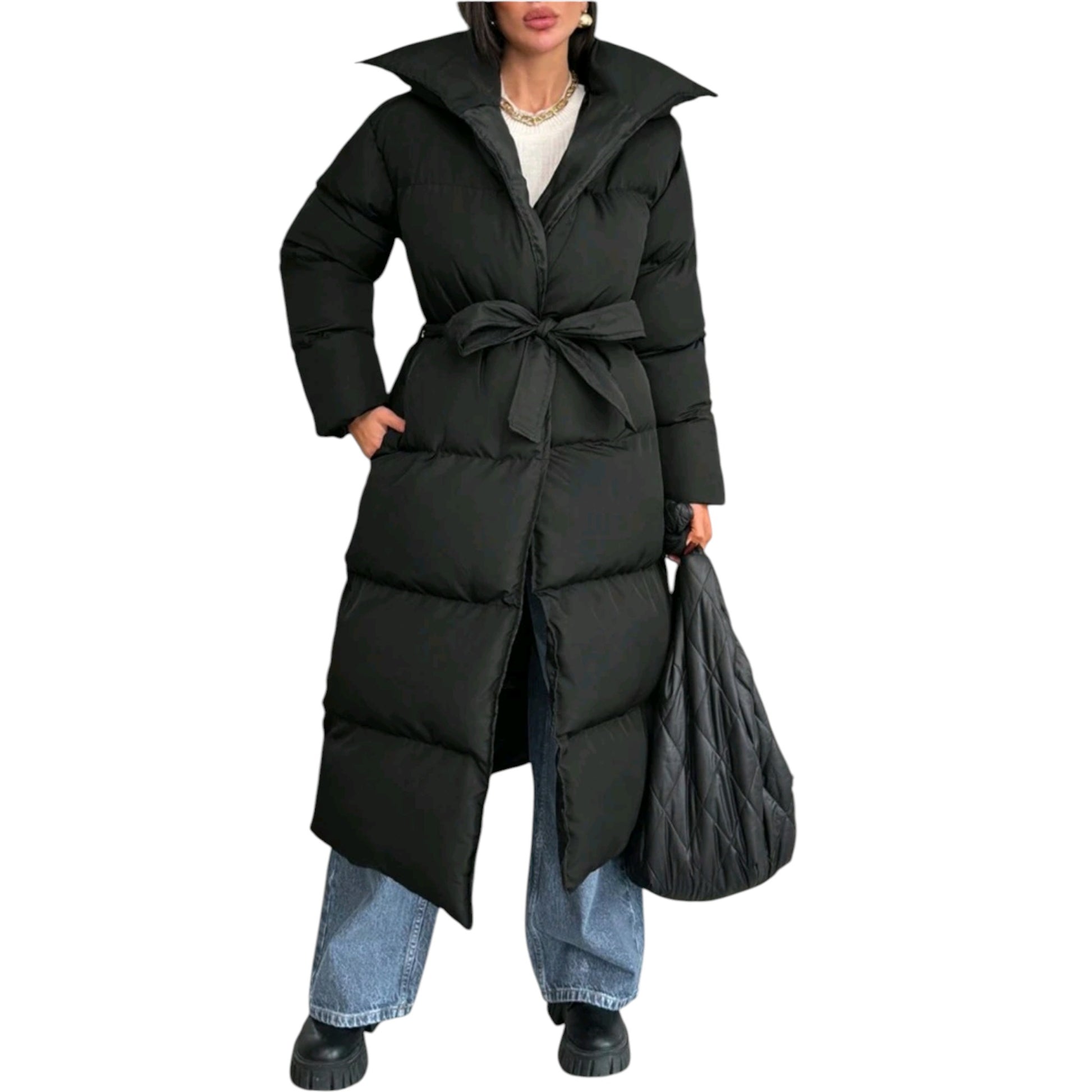 Címke nélküli, fekete, hosszú, vastagon steppelt kabát, megkötős övvel, széles gallérral.
