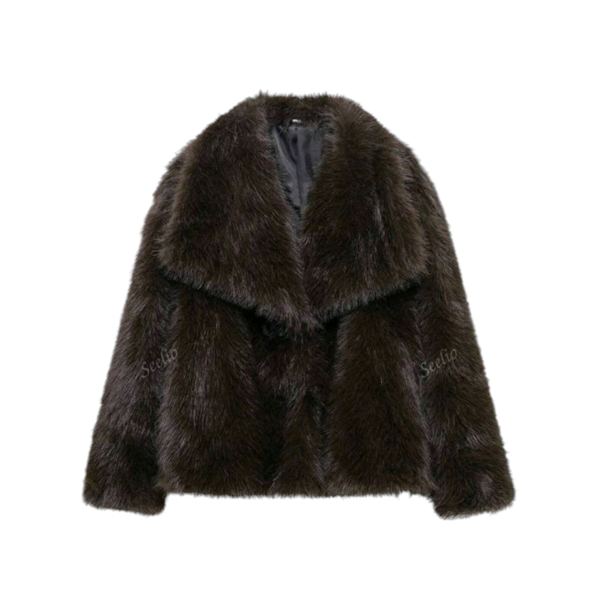 Címke nélküli, barna, rövid, szőrme hatású kabát.