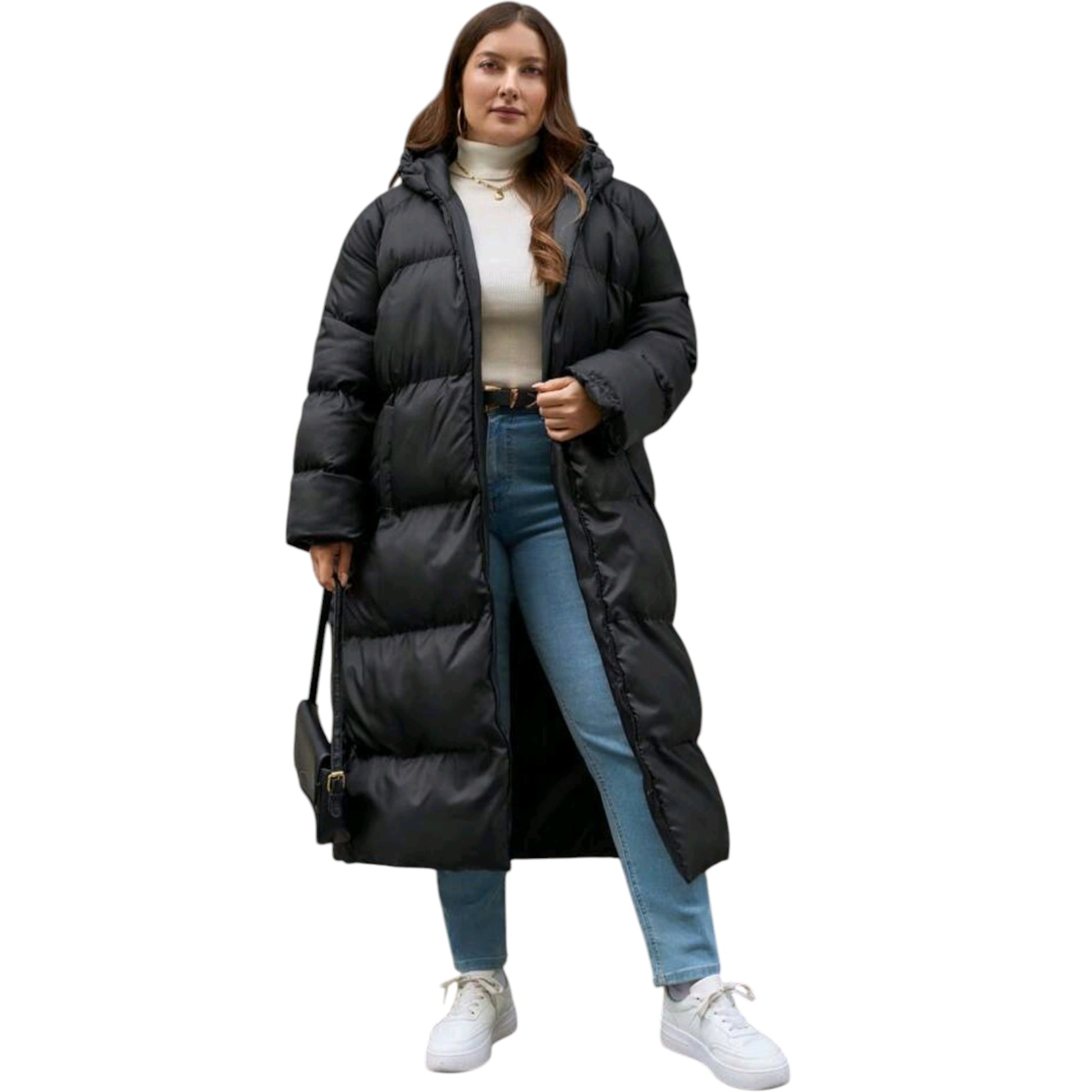 Címke nélküli, fekete, hosszú, vastagon steppelt kabát, kapucnival.