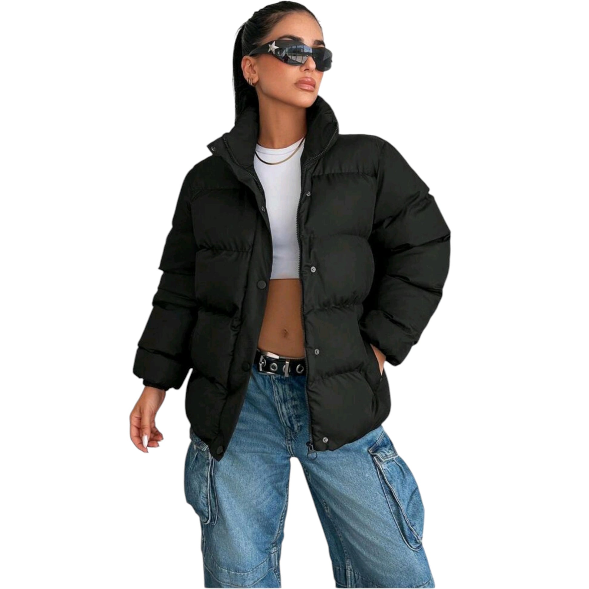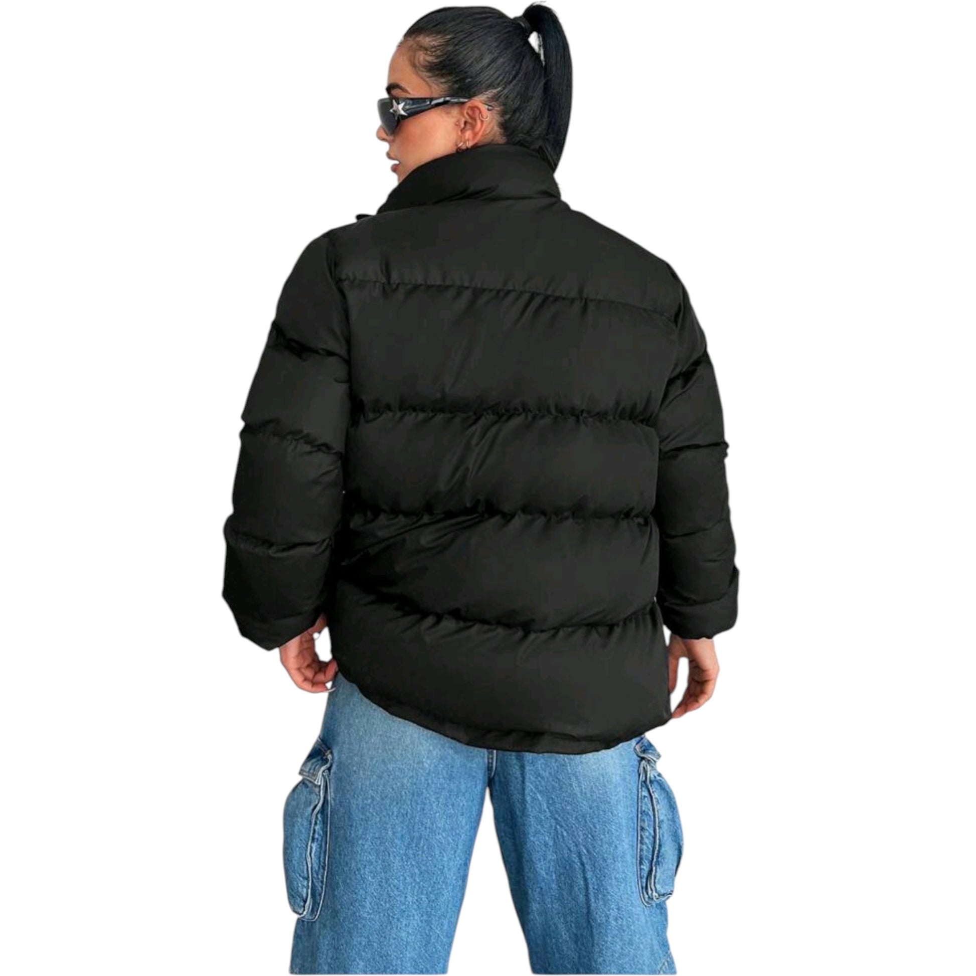 Címke nélküli, fekete, rövid, puffos kabát, magasított gallérral és patentos záródással.