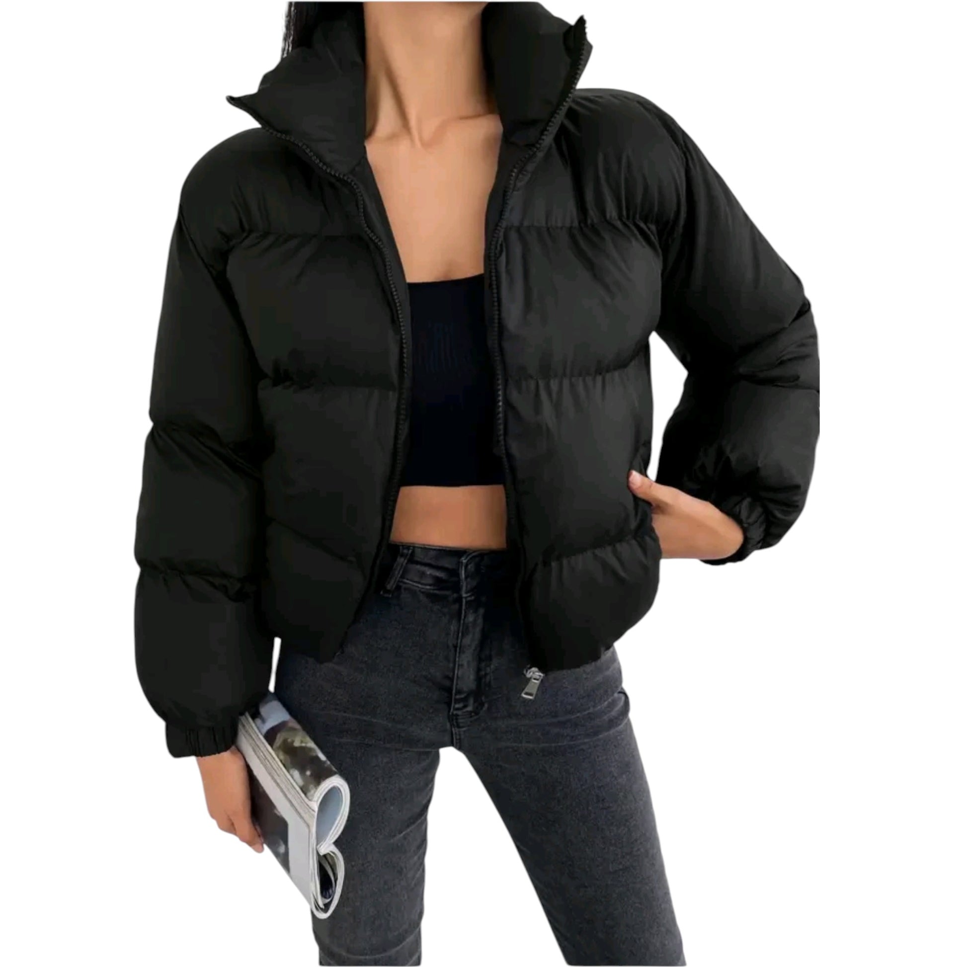 Címke nélküli, fekete, rövid, puffos kabát, magasított gallérral és cipzáros záródással.