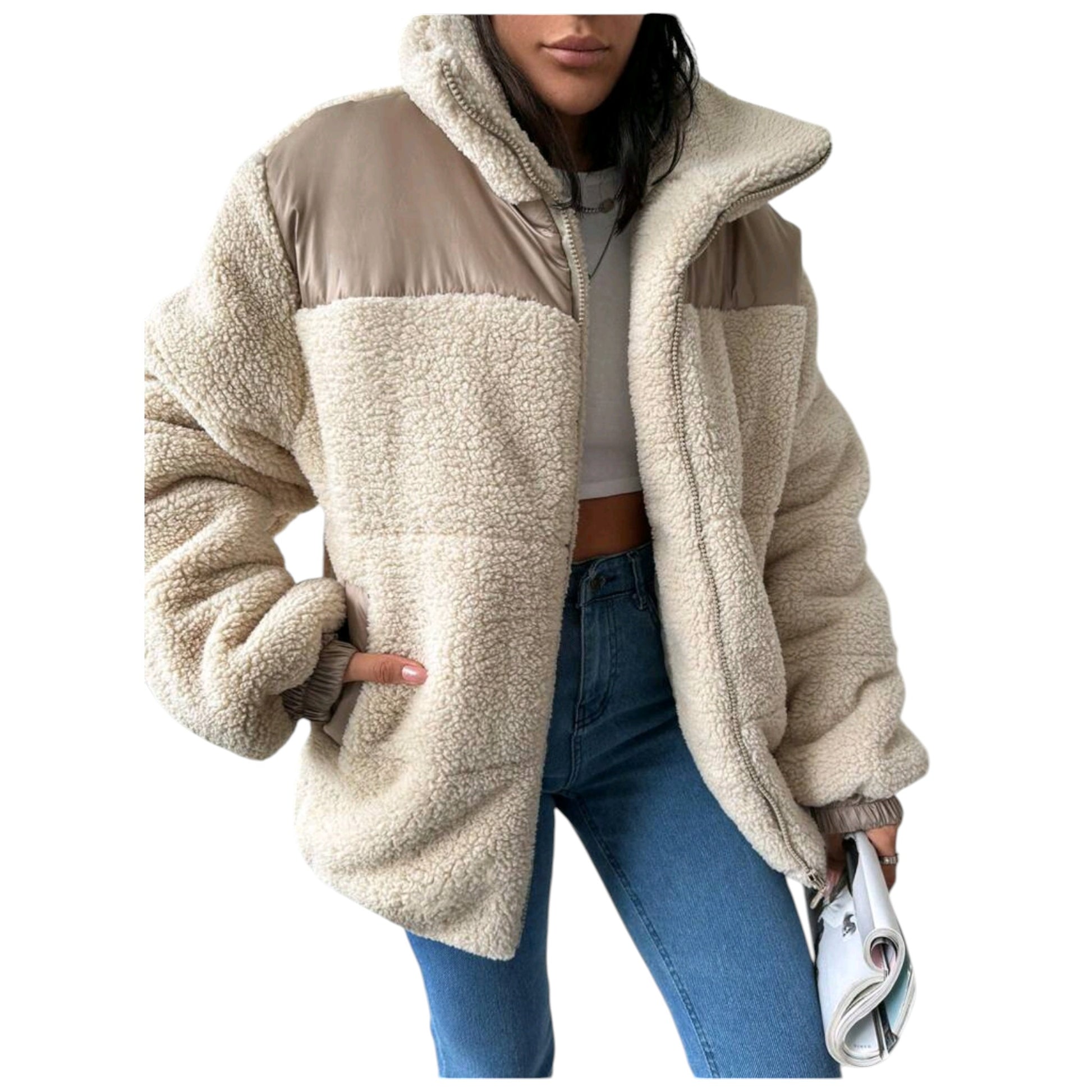 Címke nélküli, bézs, rövid, báránybunda hatású kabát, világosbarna, steppelt részekkel az elején.