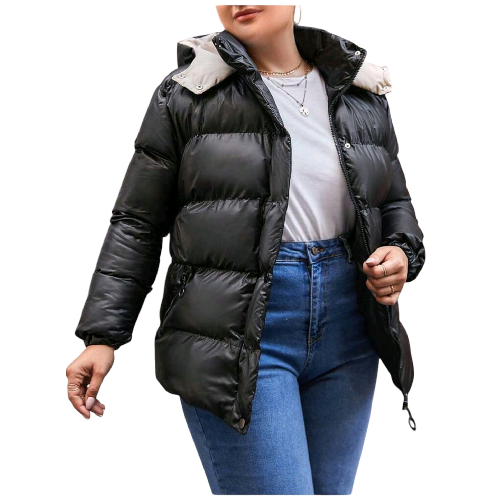 Címke nélküli, fekete, rövid, fényes, puffos téli kabát, kapucnival és cipzáros, patentos záródással.