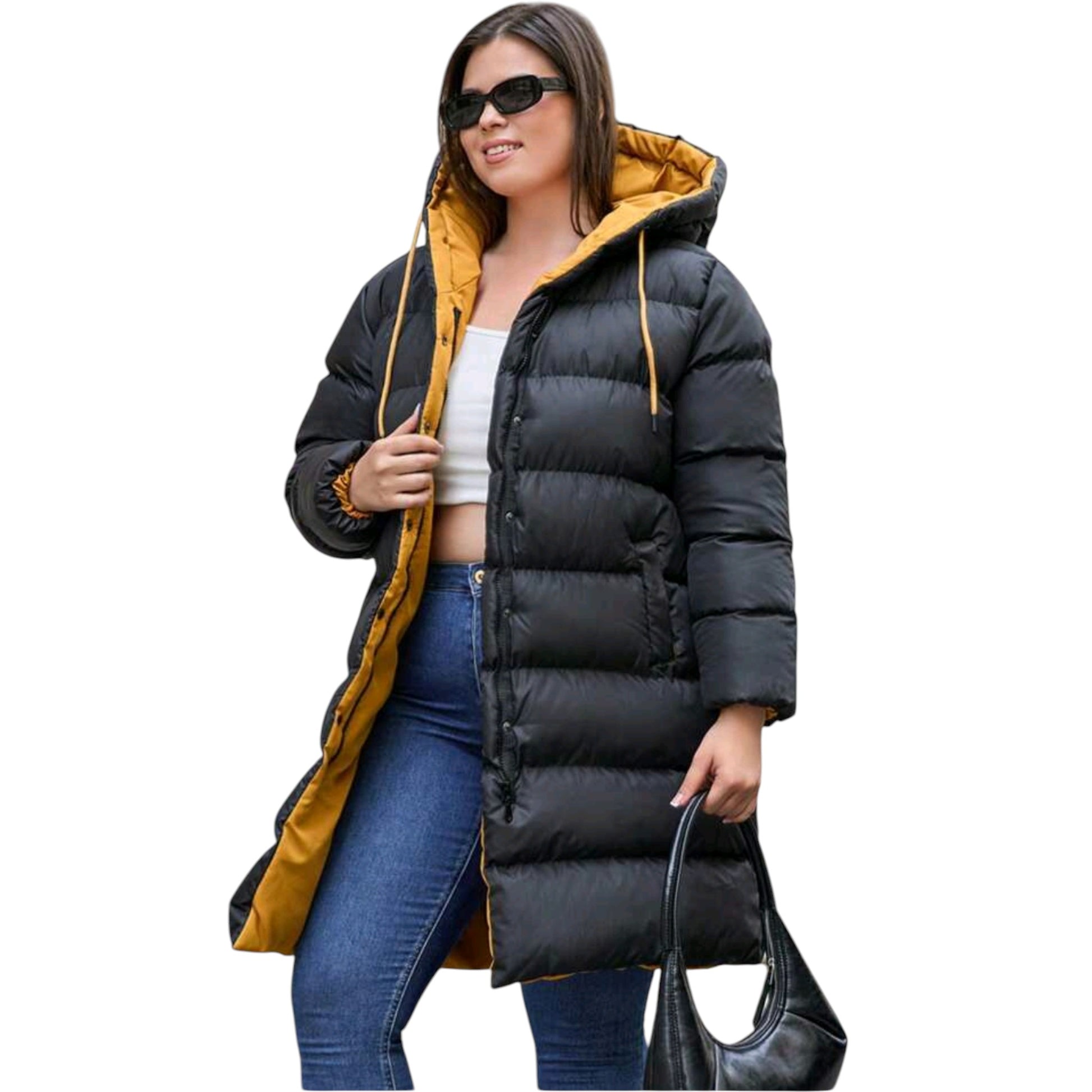 Címke nélküli, fekete, hosszú, puffos téli kabát, sárga béléssel, kapucnival és cipzáros, patentos záródással.