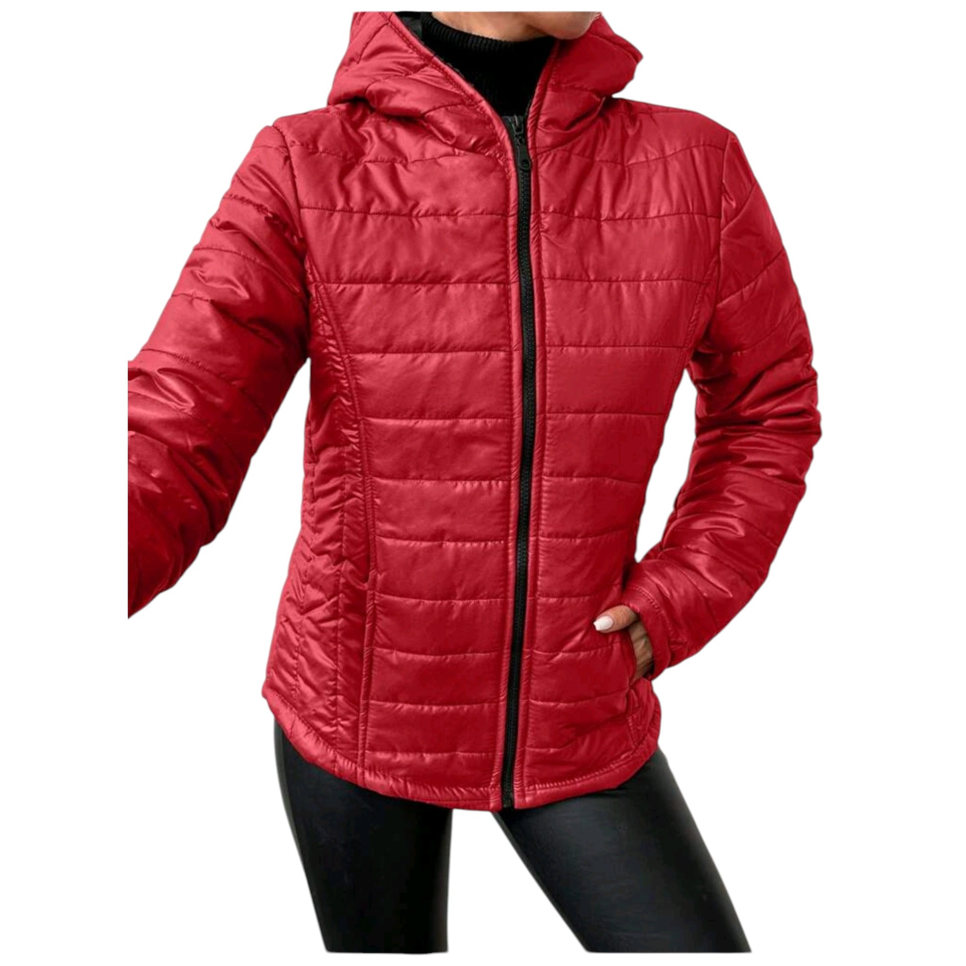 Címke nélküli, piros, rövid, puffos téli kabát, kapucnival és cipzáros záródással.