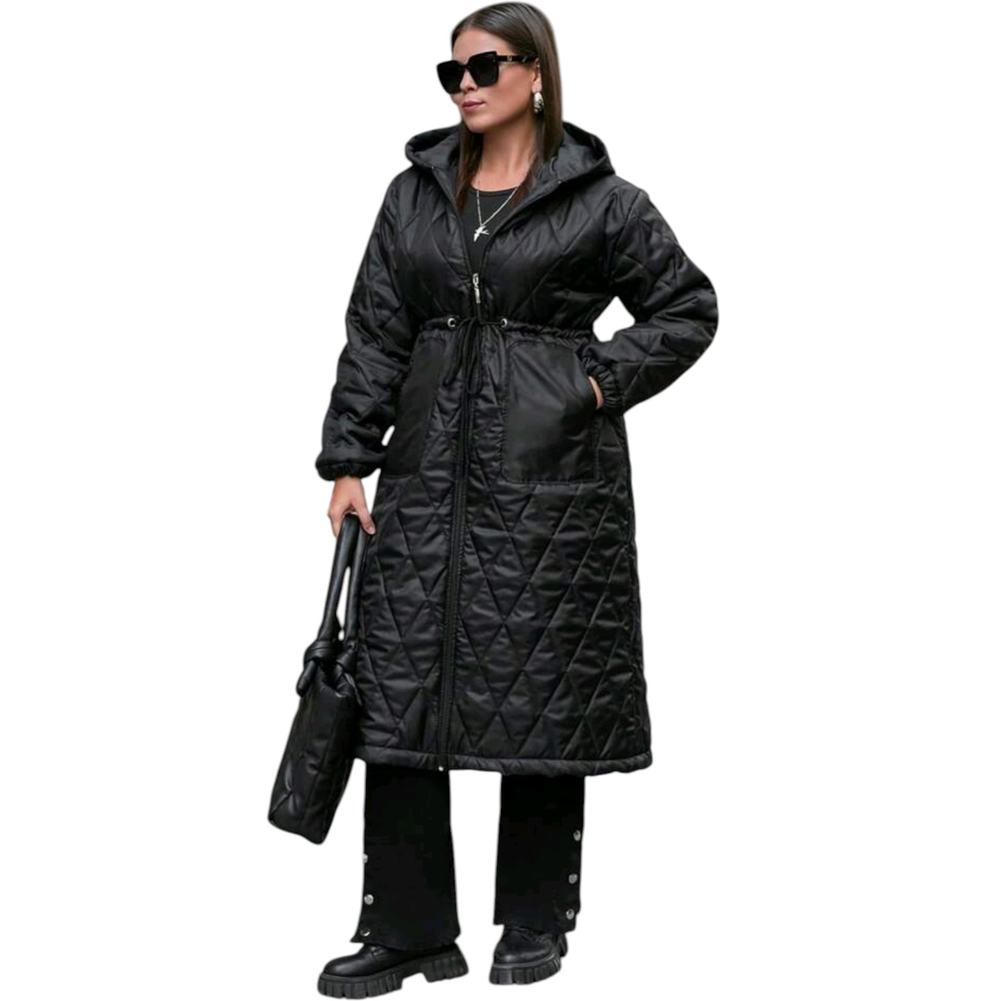 Címke nélküli, fekete, hosszú, steppelt téli kabát, kapucnival és cipzáros záródással.