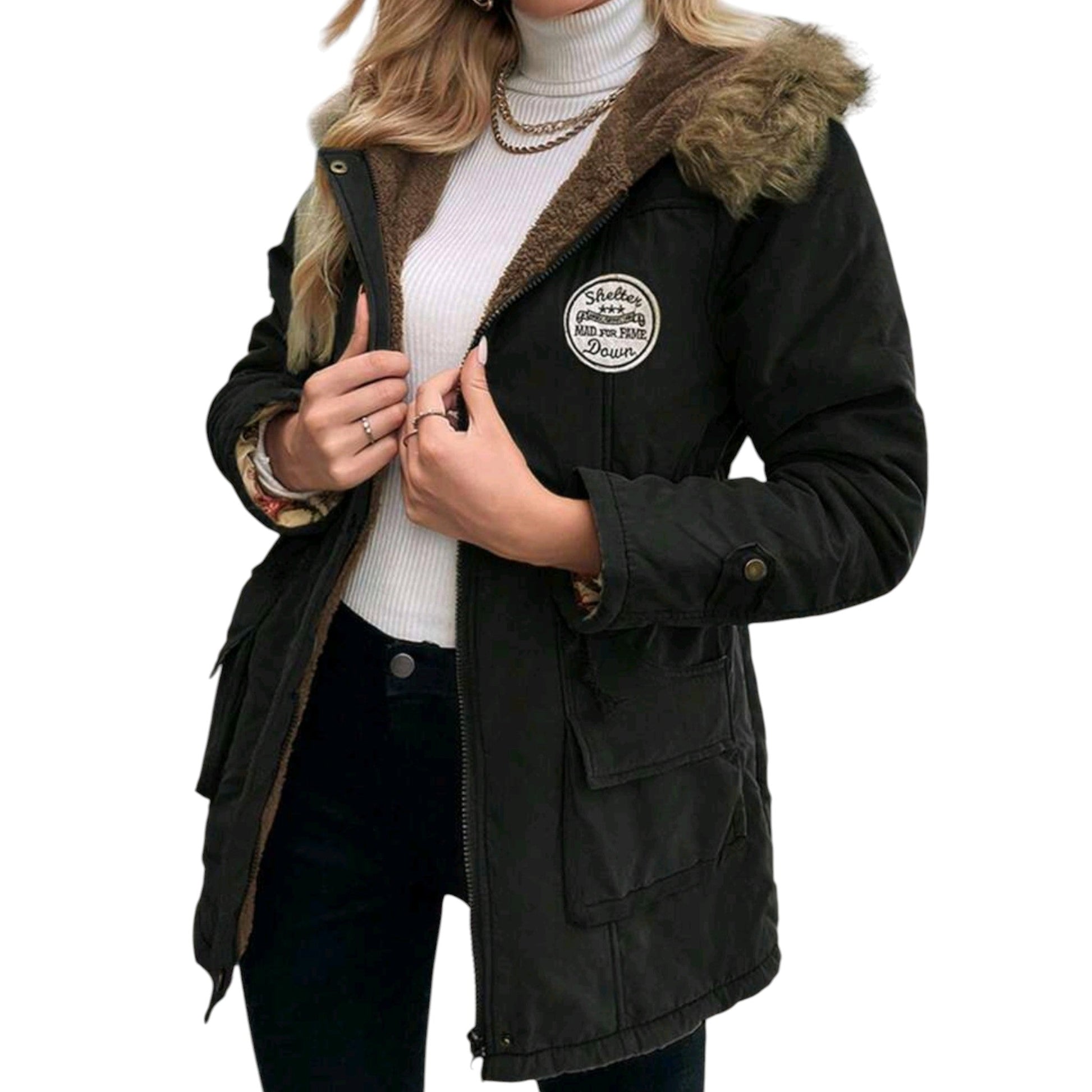 Címke nélküli, fekete, parka kabát, hosszú ujjú, plüss bélés a belső részen, fix kapucnis (nem levehető), a kapucnin műszőrme szegély, cipzáras és patentos záródás, felvarró a mellkason.