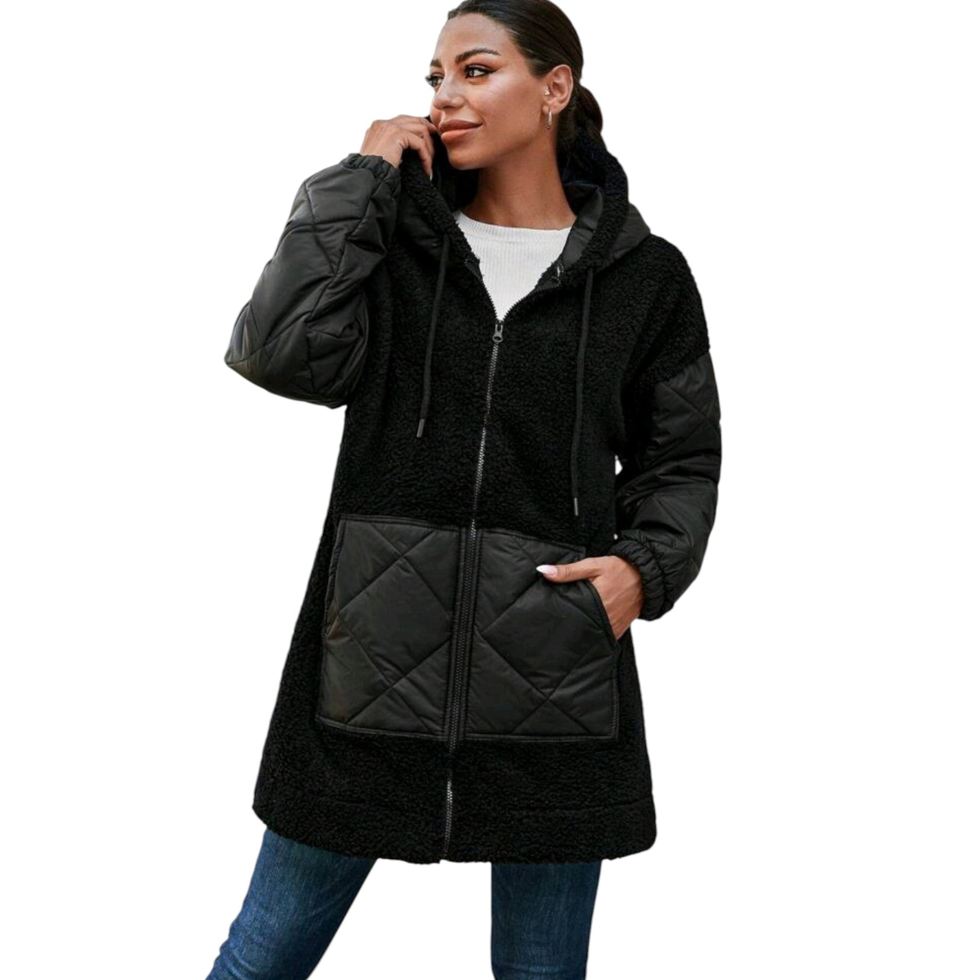 Címke nélküli, fekete, hosszú fazon, plüss (teddy) anyagú test és steppelt ujj és zseb rész, hosszú ujjú, fix kapucnis (nem levehető), cipzáras záródás, kabát.