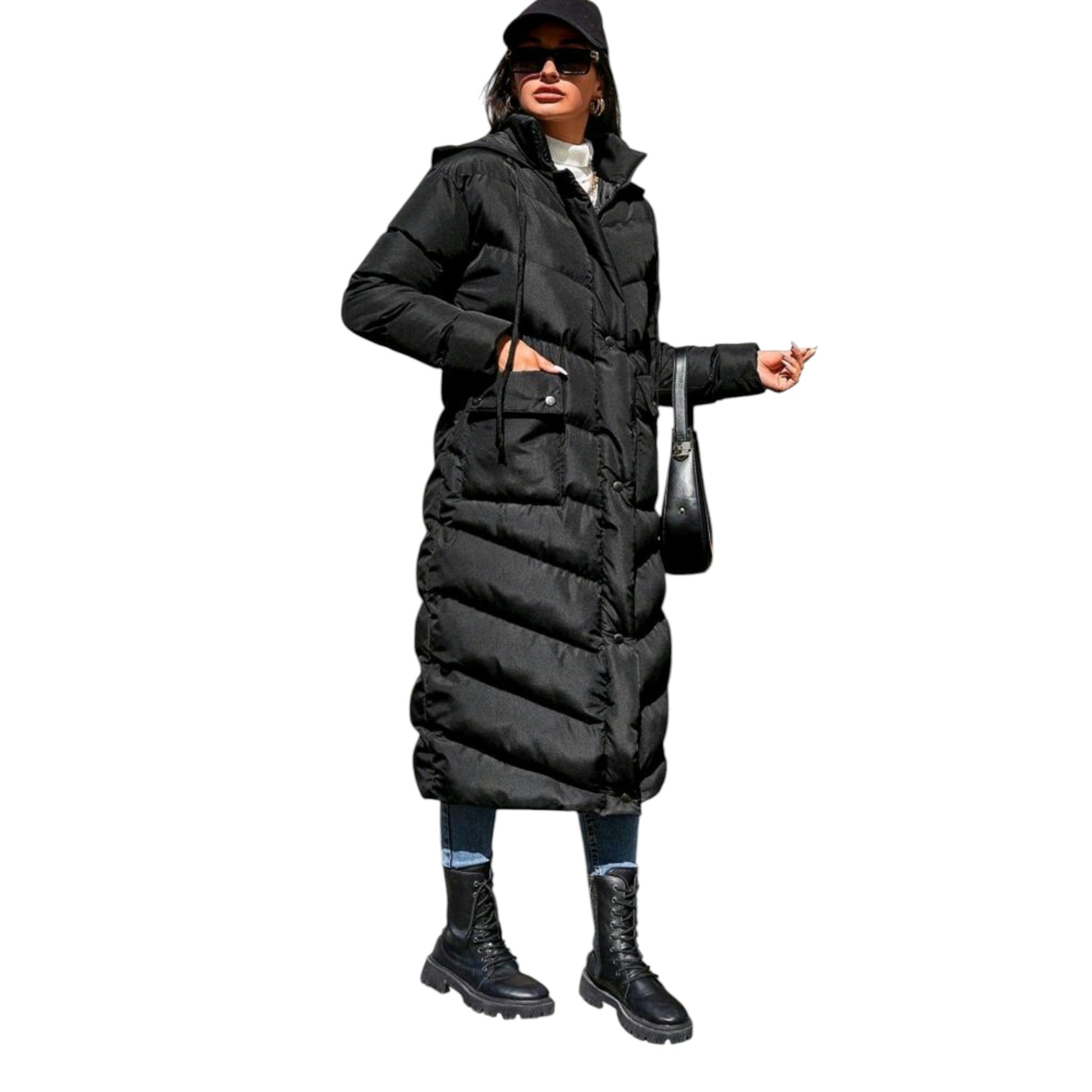 Címke nélküli, fekete, steppelt, V-alakban mintázott, hosszú ujjú, kapucnis, hosszú pufi kabát.