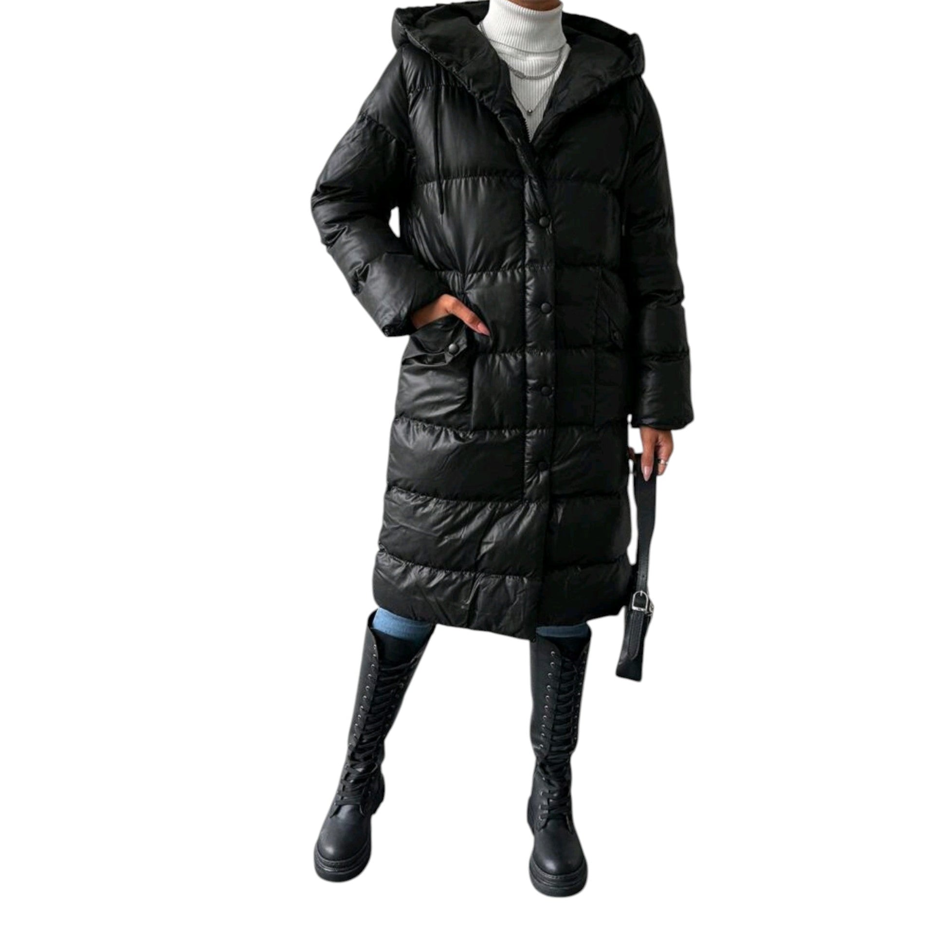 Címke nélküli, fekete, steppelt, hosszú ujjú, gombos záródású, fix kapucnis, hosszú pufi kabát.