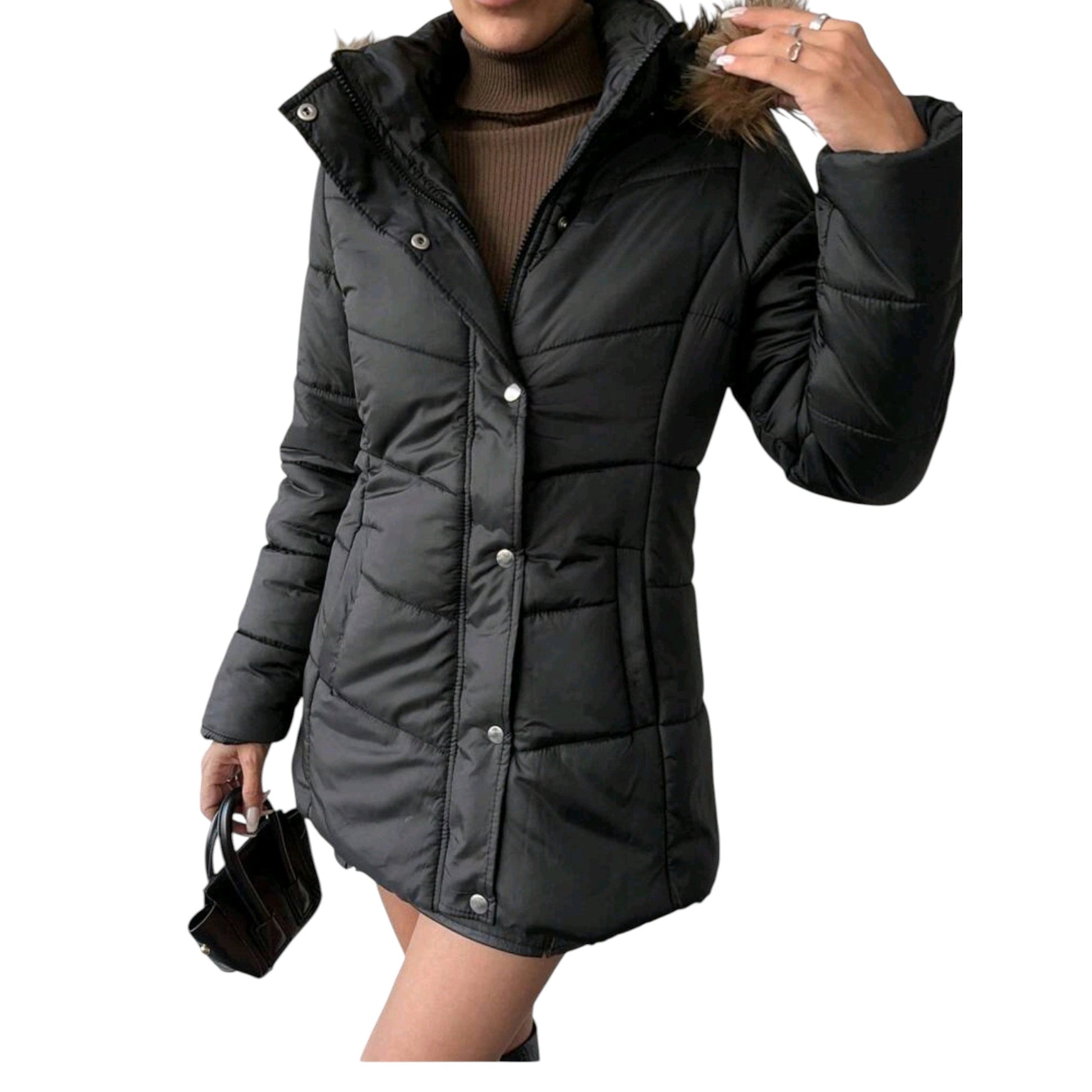 SHE fekete műszőrme kapucnis téli kabát