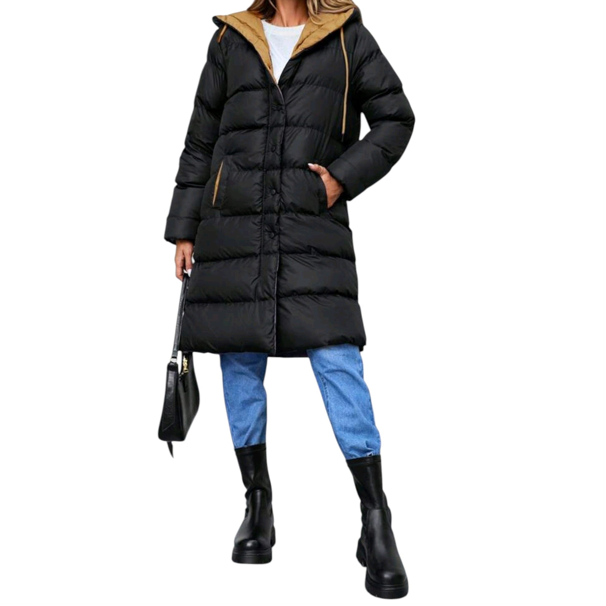 Címke nélküli, fekete, steppelt, hosszú ujjú, kapucnis, gombos záródású, lábszárközépig érő, belül barna színű bélésű pufi kabát.