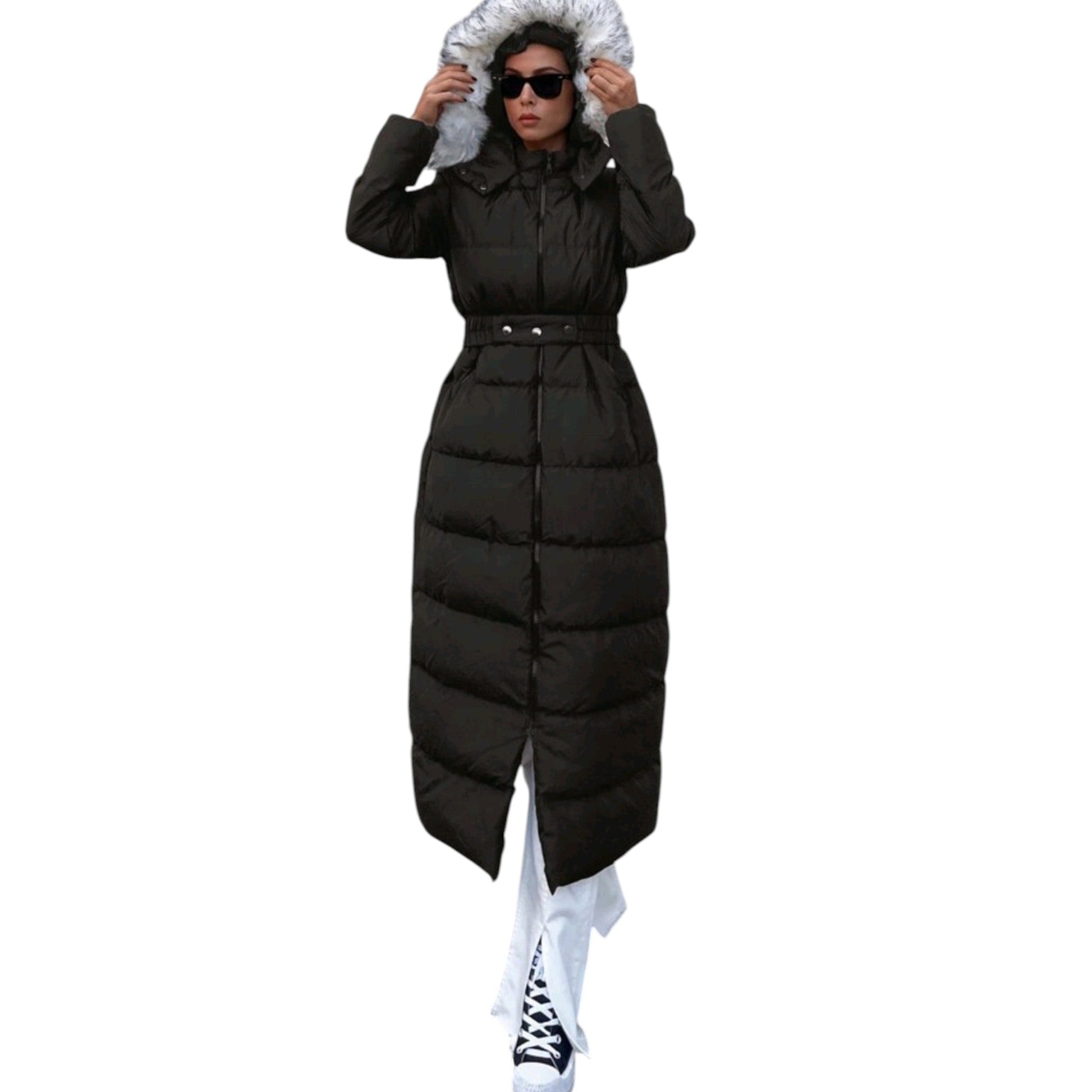 Címke nélküli, fekete, steppelt, hosszú ujjú, fix kapucnis, fehér műszőrme szegéllyel díszített, megkötős derekú, hosszú pufi kabát.