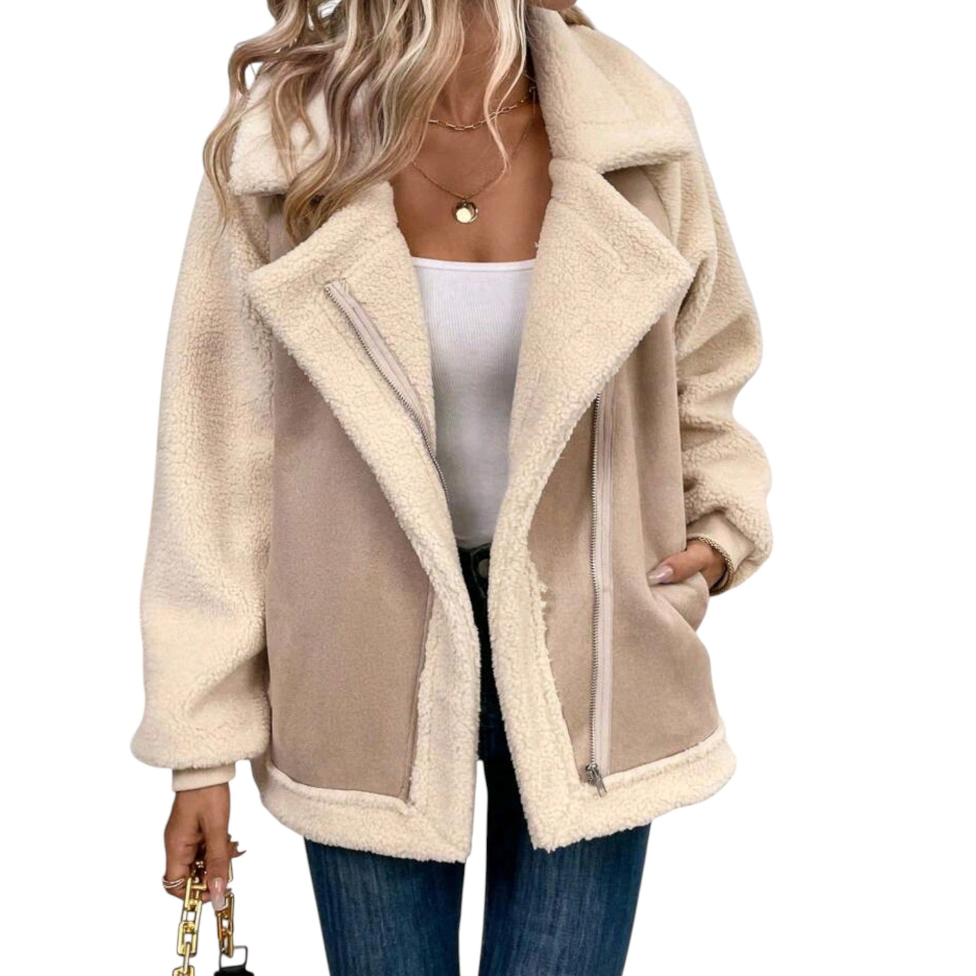 Címke nélküli, bézs/krém, rövidebb, hosszú ujjú, gyapjúhatású anyaggal bélelt és díszített, kordbársony/velúr hatású kabát, széles gallér, cipzáras záródás.