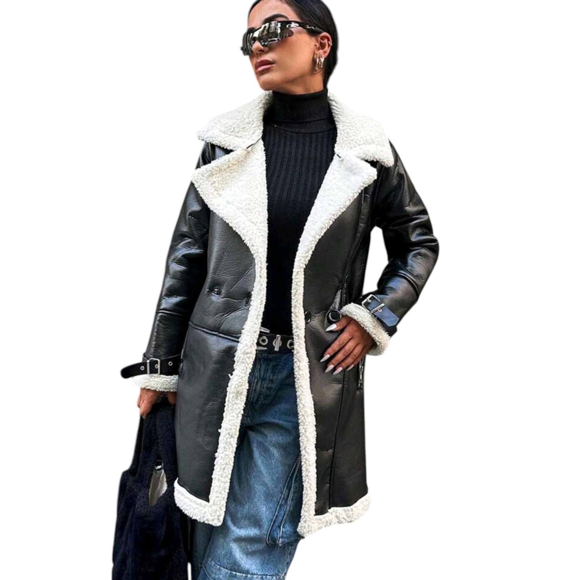 Címke nélküli, fekete, hosszabb szabású, műbőr/bőr hatású anyag, fehér gyapjúhatású béléssel és szegéllyel, széles, fehéren bélelt gallér, hosszú ujjú, elöl nyitott fazon.