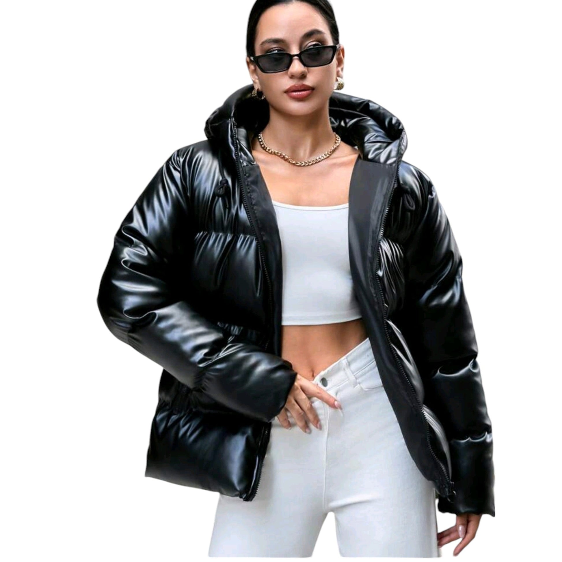 SHE fekete bőr hatású kapucnis pufi dzseki