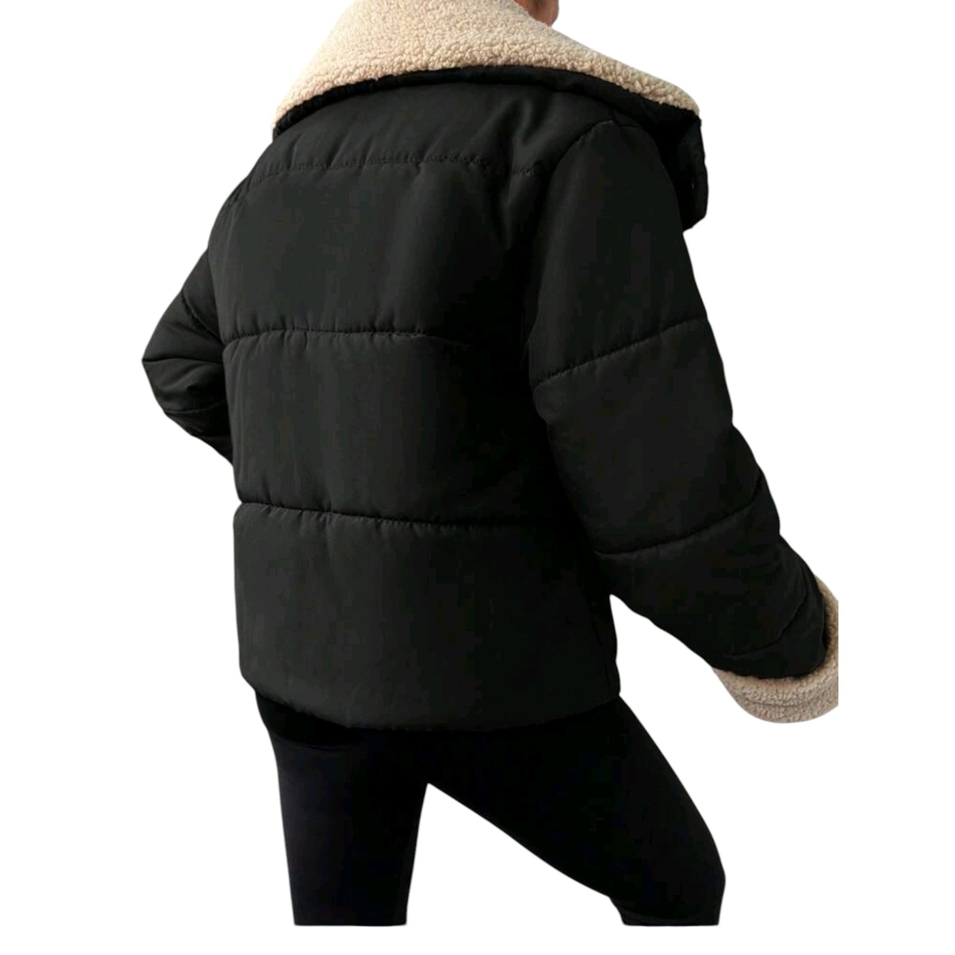 Címke nélküli, fekete, rövid, steppelt pufi dzseki, krémszínű műszőrme gallérral és mandzsettával, elöl patenttal és cipzárral záródik.