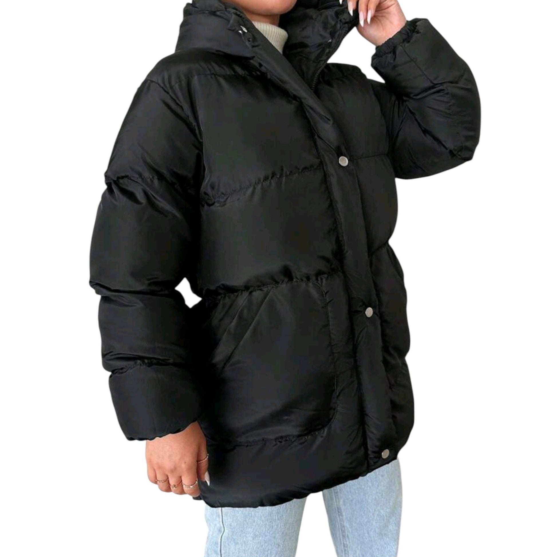 Címke nélküli, fekete, hosszú, steppelt téli kabát, kapucnival, elöl patenttal és cipzárral záródik.