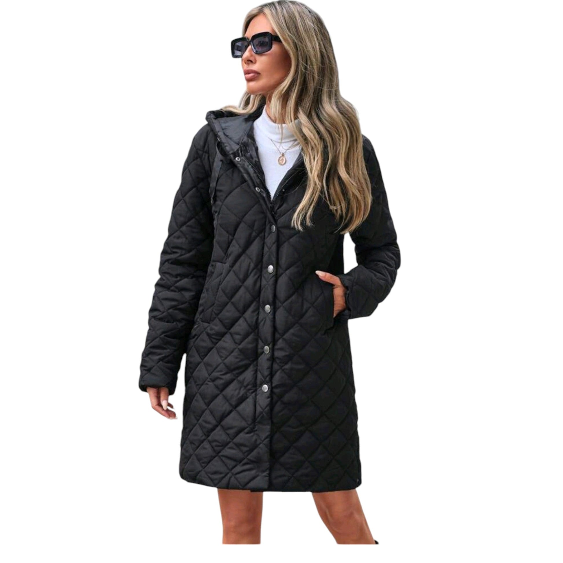 Címke nélküli, fekete, hosszú, gyémánt mintás steppelt kabát, kapucnival, elöl patenttal záródik.