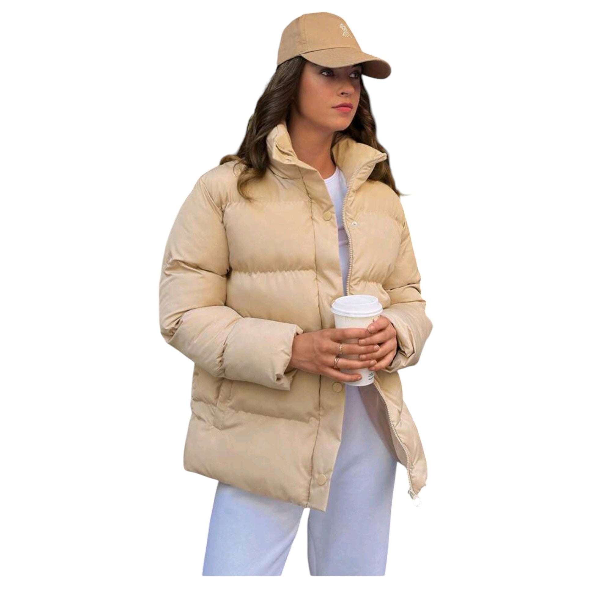 Címke nélküli, bézs, rövid, steppelt pufi dzseki, magas gallérral, elöl patenttal és cipzárral záródik.