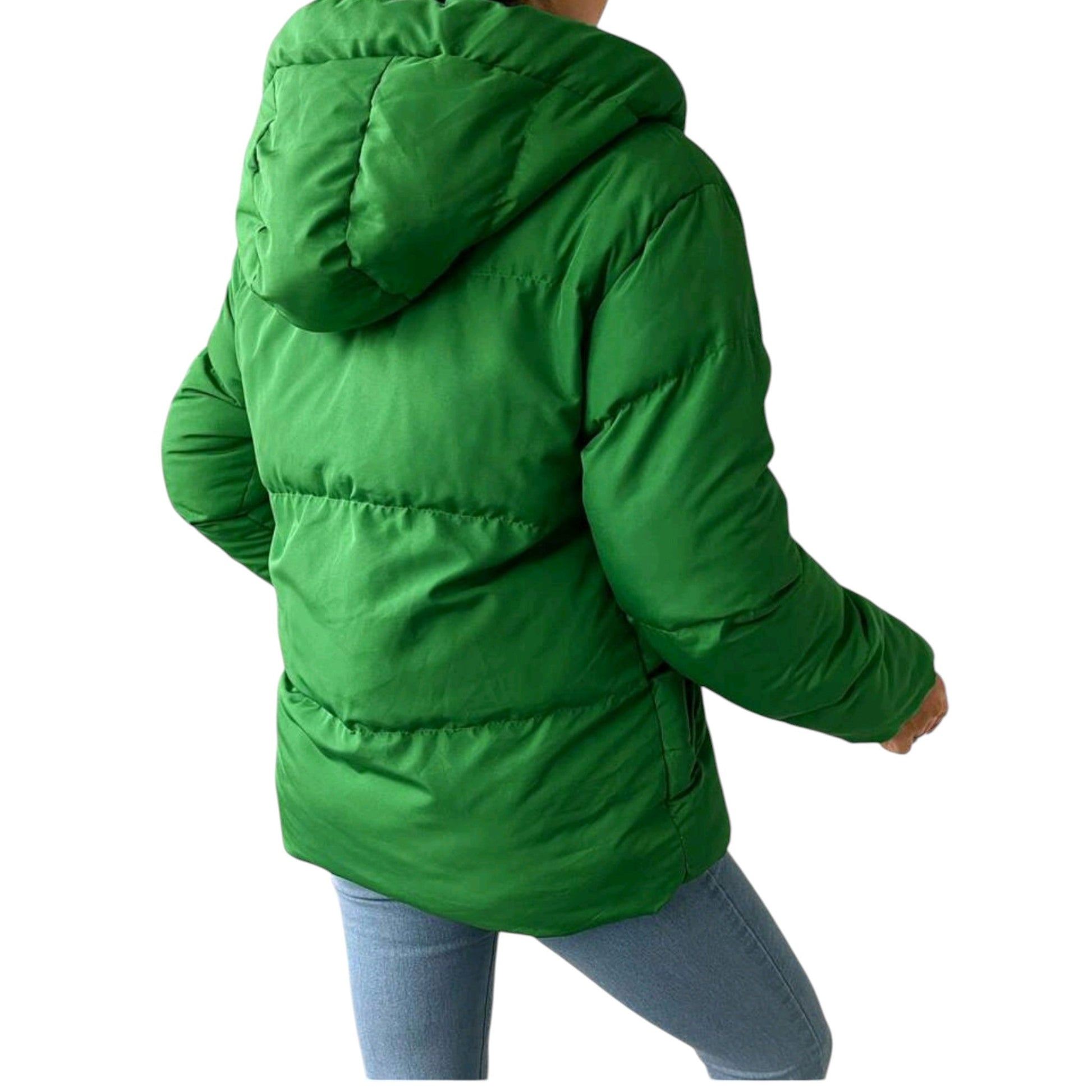 Címke nélküli, zöld, rövid, steppelt pufi dzseki, kapucnival, elöl cipzárral záródik.