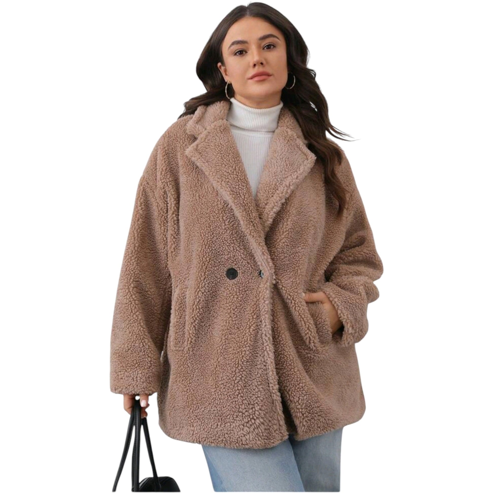 Címke nélküli, barna, oversize, báránybőr/teddy hatású műszőrme kabát, hajtókás gallérral, elöl egy gombbal, oldalsó zsebekkel.