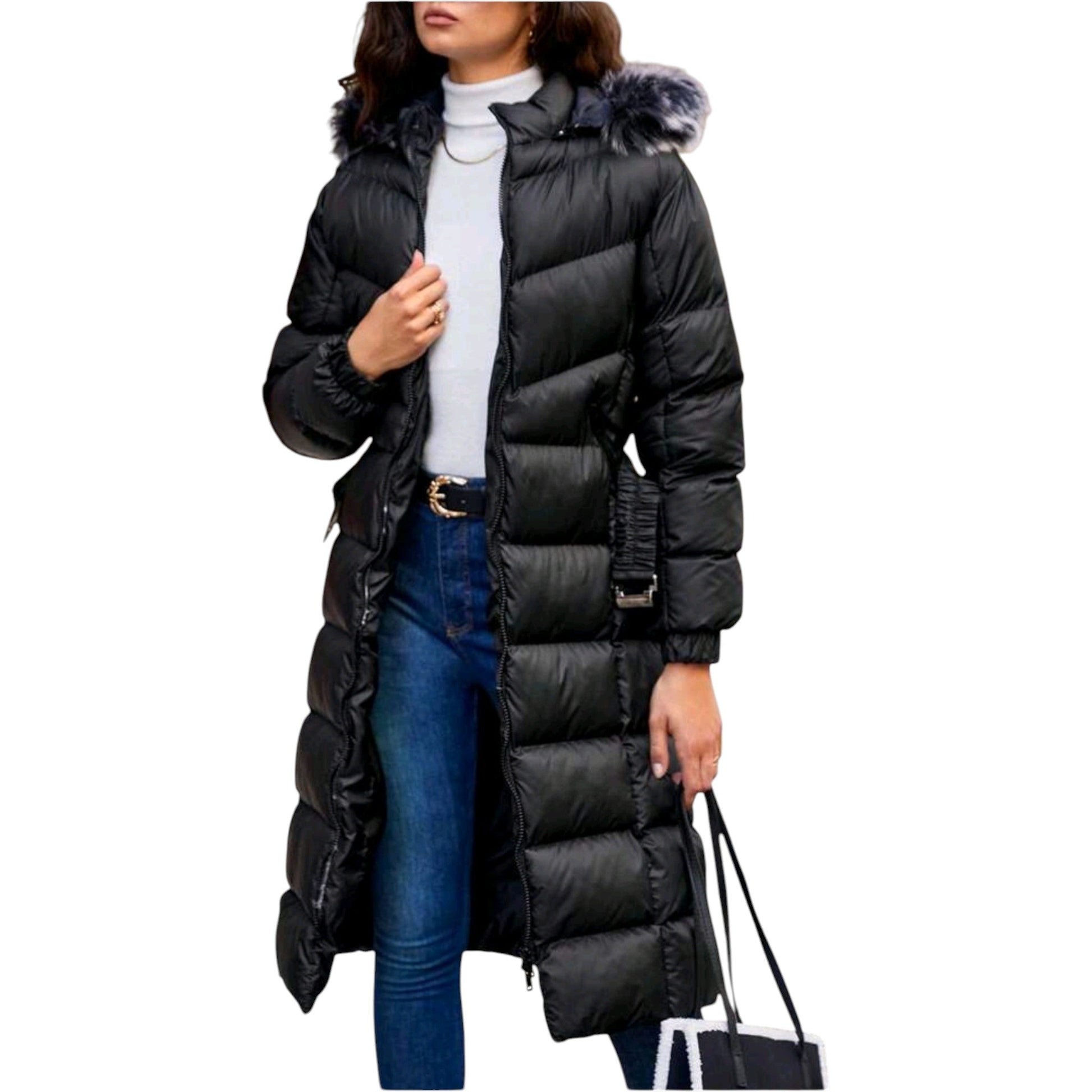 Címke nélküli, fekete, steppelt, hosszú fazonú télikabát, kapucnival, műszőrme szegéllyel, elöl cipzárral, deréknál állítható pánttal.