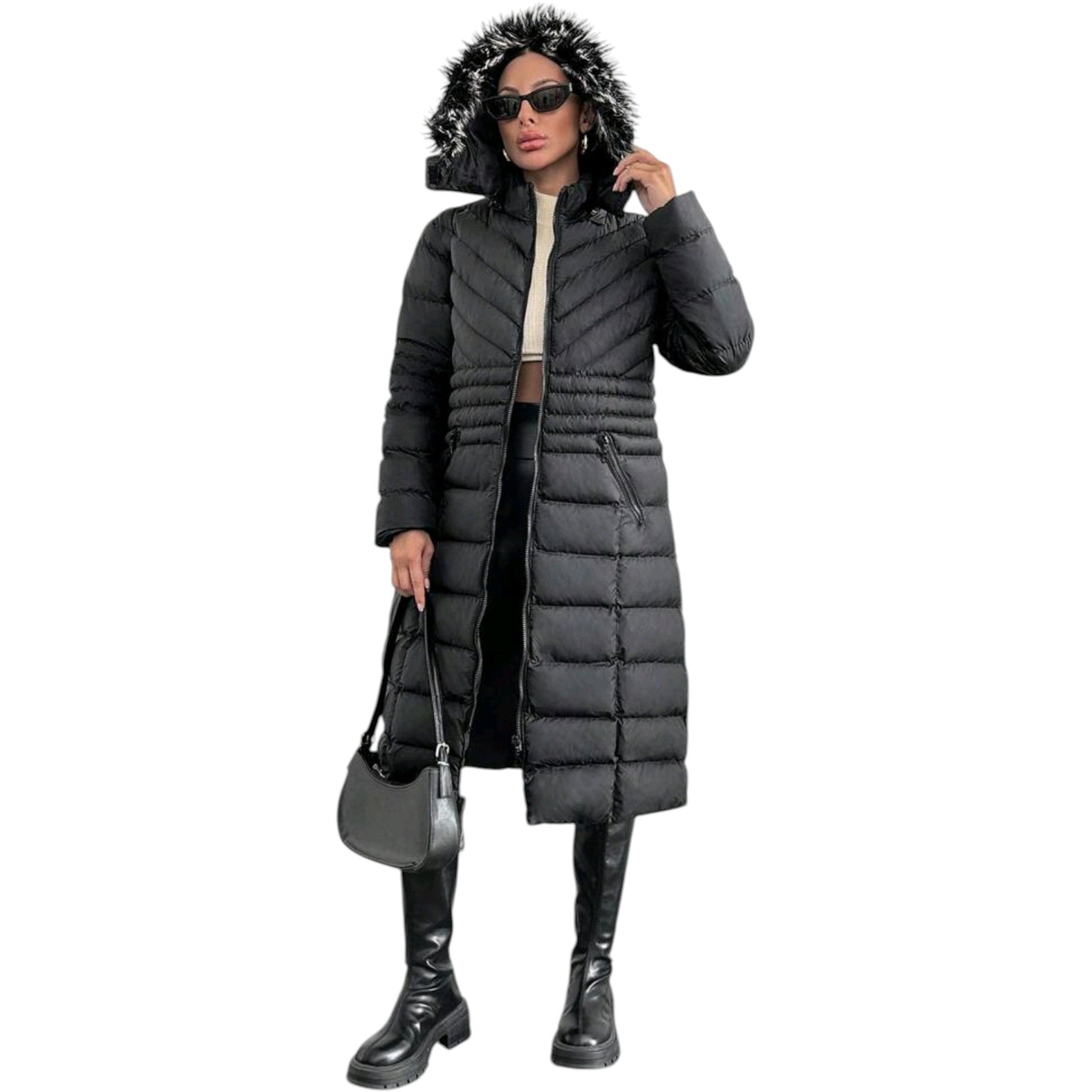 Címke nélküli, fekete, steppelt, hosszú fazonú télikabát, kapucnival, műszőrme szegéllyel, elöl cipzárral, deréknál húzott.