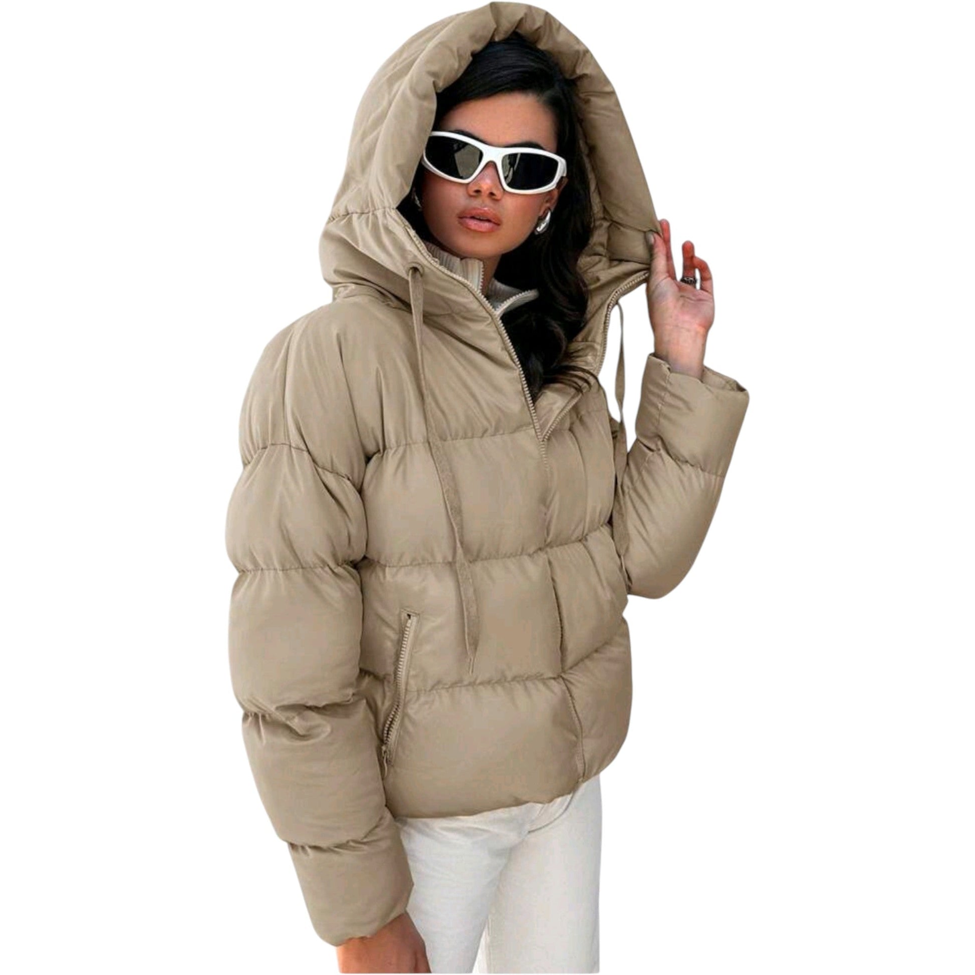 Címke nélküli, bézs, rövid, pufi dzseki, fix, nagy kapucnival, elöl cipzárral, elöl két cipzáros zsebbel, húzózsinóros kapucni.