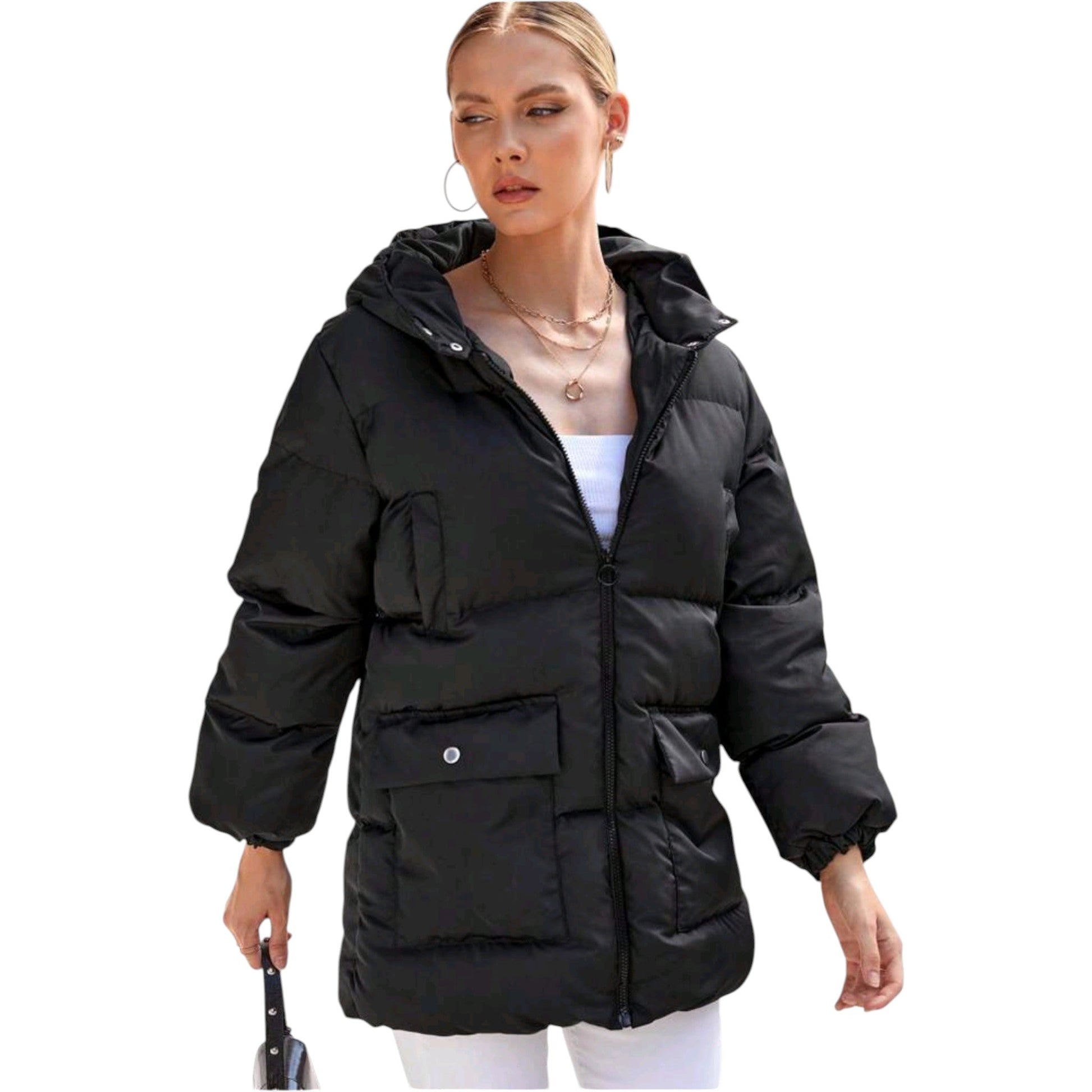 Címke nélküli, fekete, hosszított, bő fazonú pufi dzseki, fix kapucnival, elöl cipzárral, elöl nagy, patentos rávarrt zsebekkel, gumírozott ujjvégek.