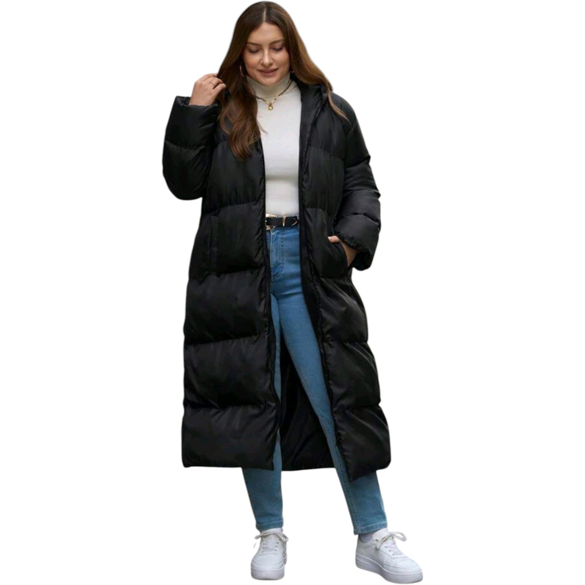 Címke nélküli, fekete, extra hosszú, vastagon steppelt, pufi kabát, kapucnival, elöl cipzárral, oldalsó zsebekkel.