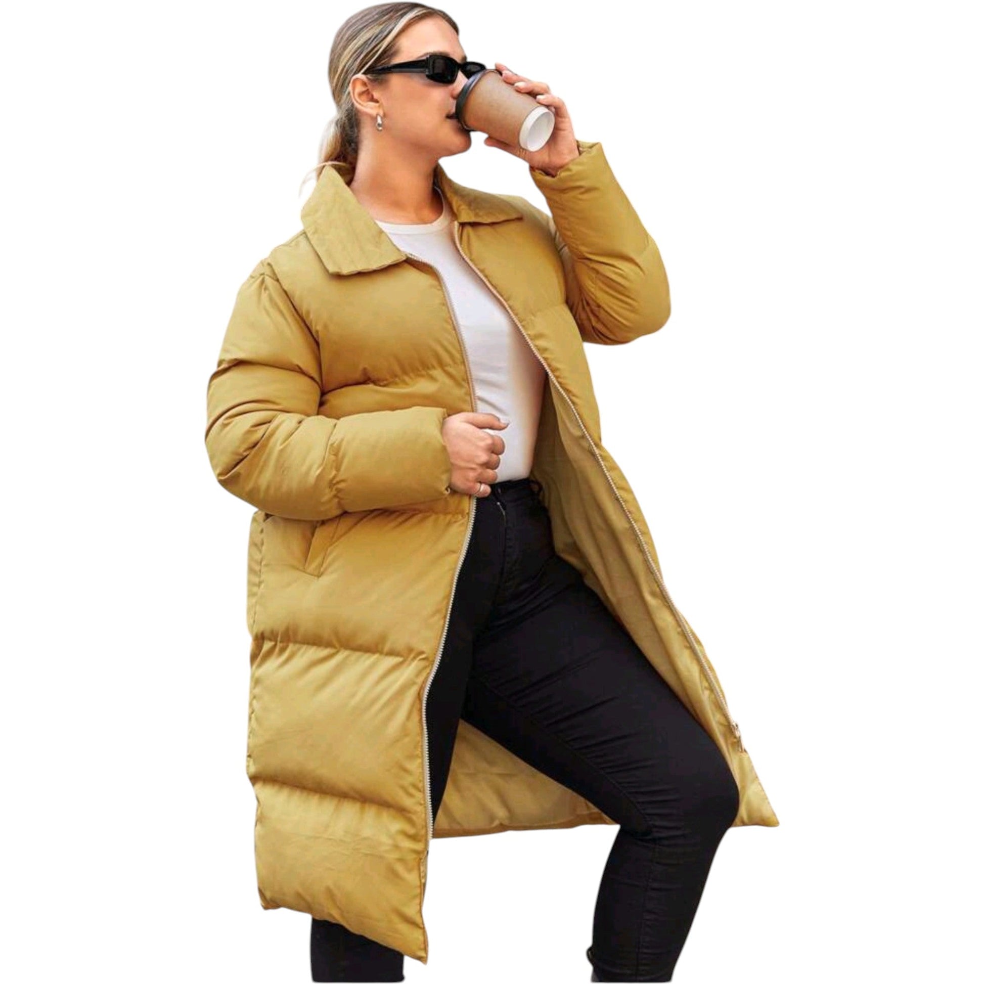 Címke nélküli, mustársárga, vastagon steppelt, hosszú fazonú kabát, galléros nyakkivágással, elöl cipzárral, oldalsó zsebekkel.