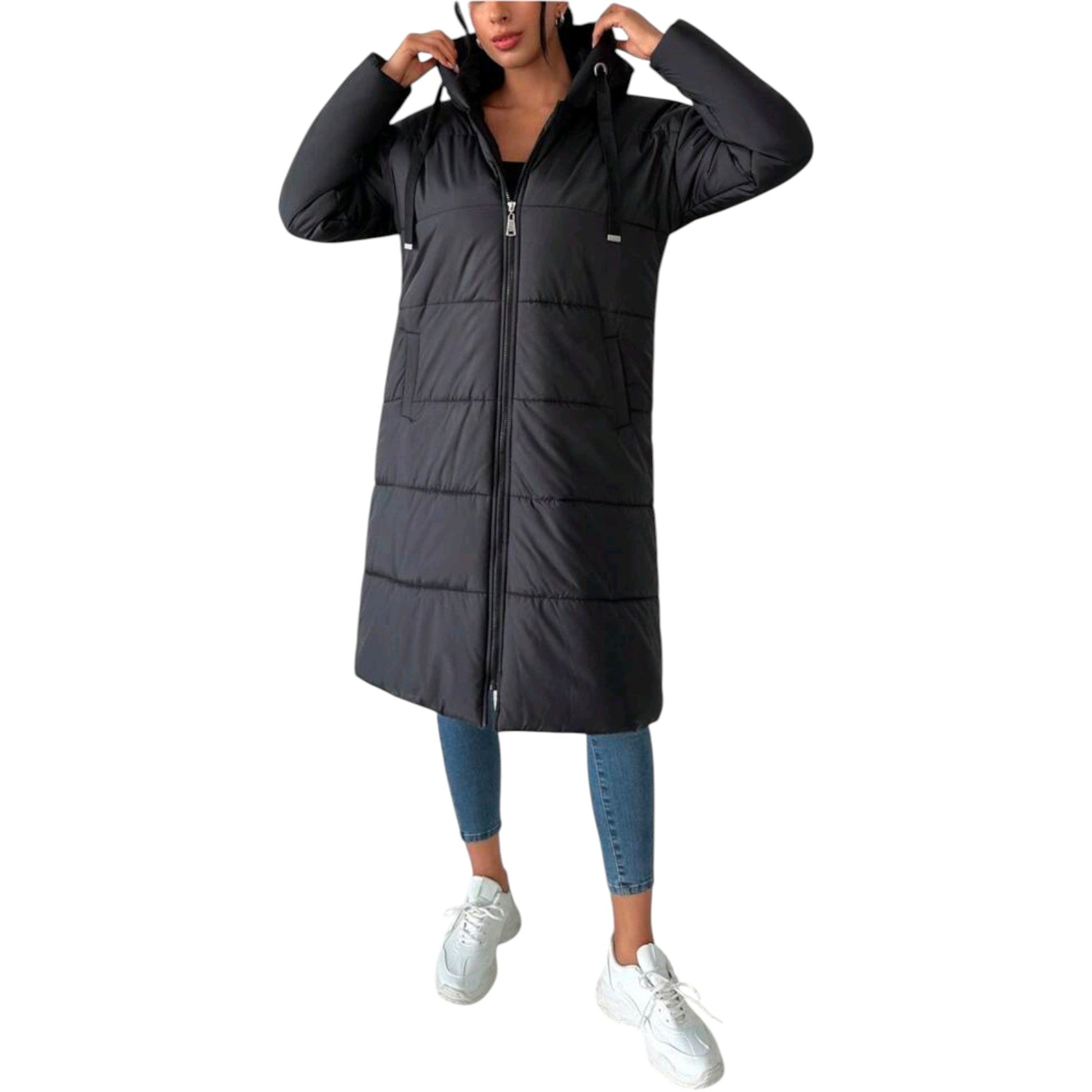 Címke nélküli, fekete, hosszú, enyhén oversize fazonú pufi kabát, fix kapucnival, elöl kétirányú cipzárral, húzózsinór a kapucnin.