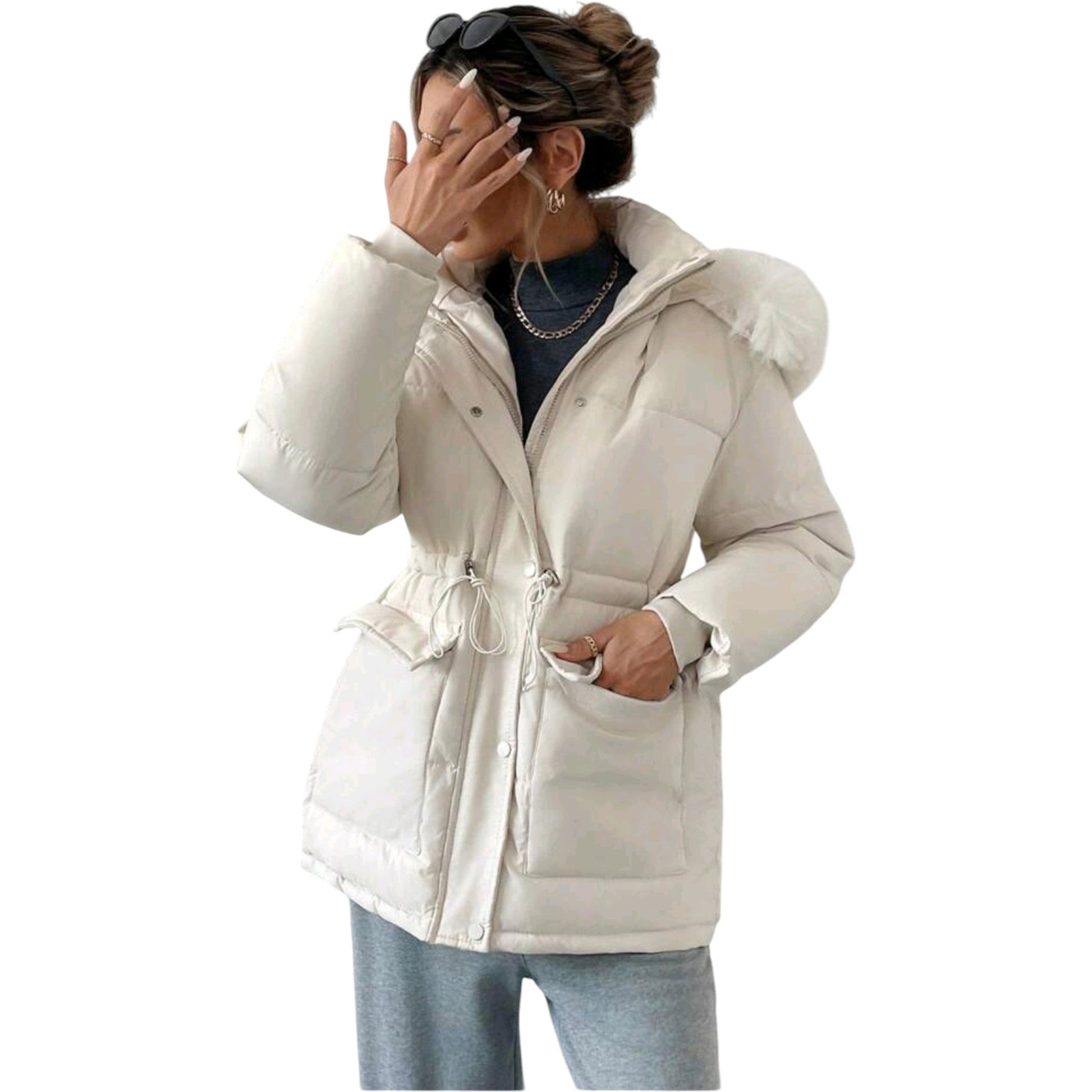 Címke nélküli, fehér, hosszított fazonú pufi kabát, kapucnival, nagyméretű, világos műszőrme szegéllyel, deréknál húzózsinórral állítható, elöl cipzárral és patentokkal, elöl nagy, patentos rávarrt zsebekkel.