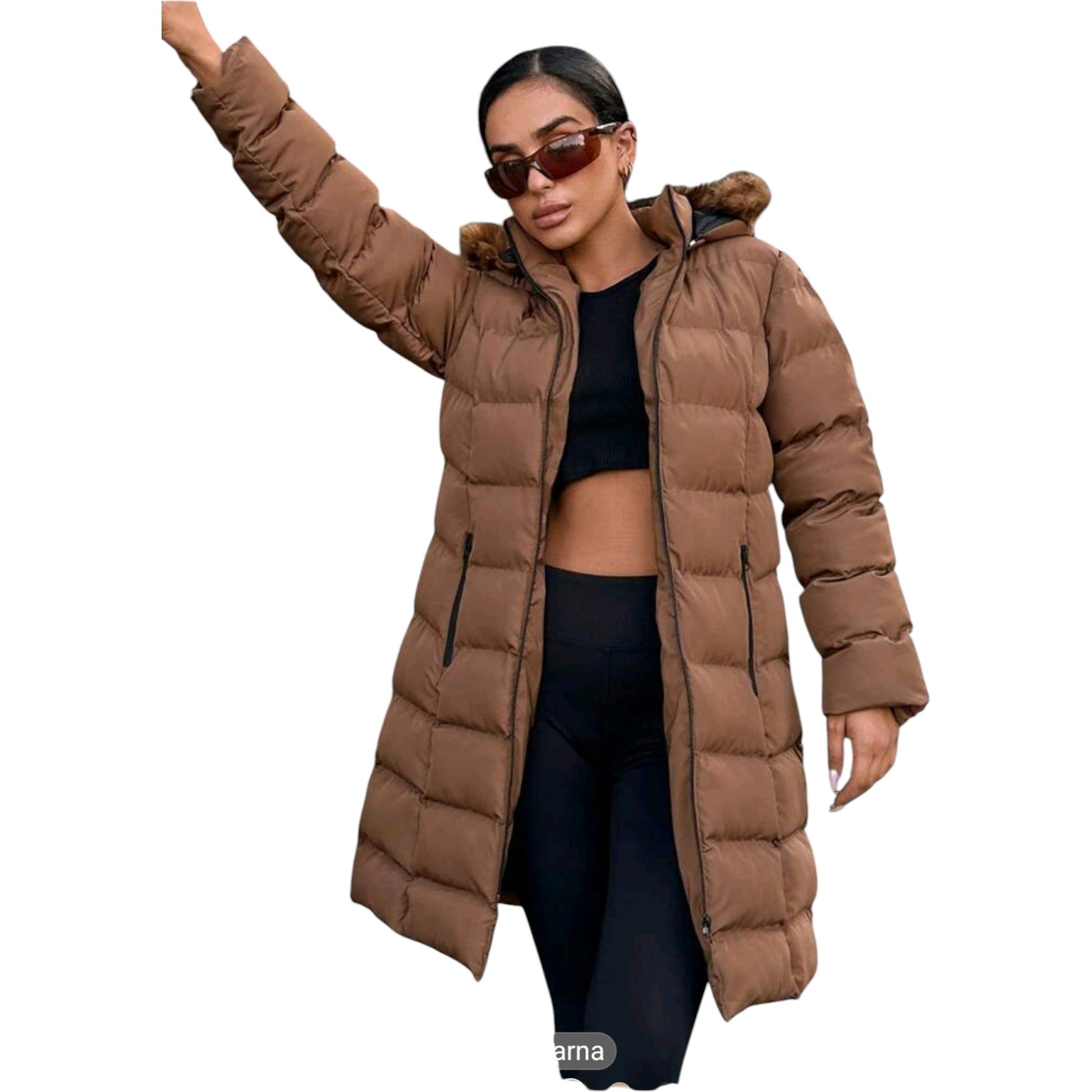 Címke nélküli, barna, hosszú, steppelt télikabát, kapucnival és műszőrme szegéllyel, hosszú ujjú, elől cipzárral.