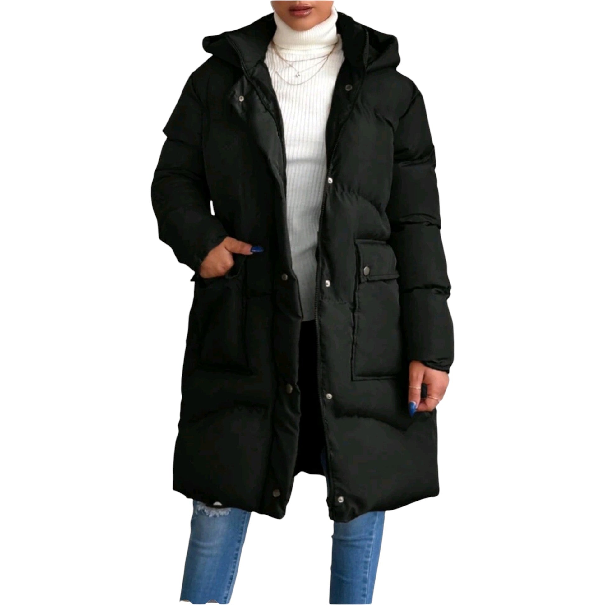 Címke nélküli, fekete, hosszú, steppelt télikabát, fix kapucnival, hosszú ujjú, elől patentos fedőpánttal, karcsúsított derékkal.