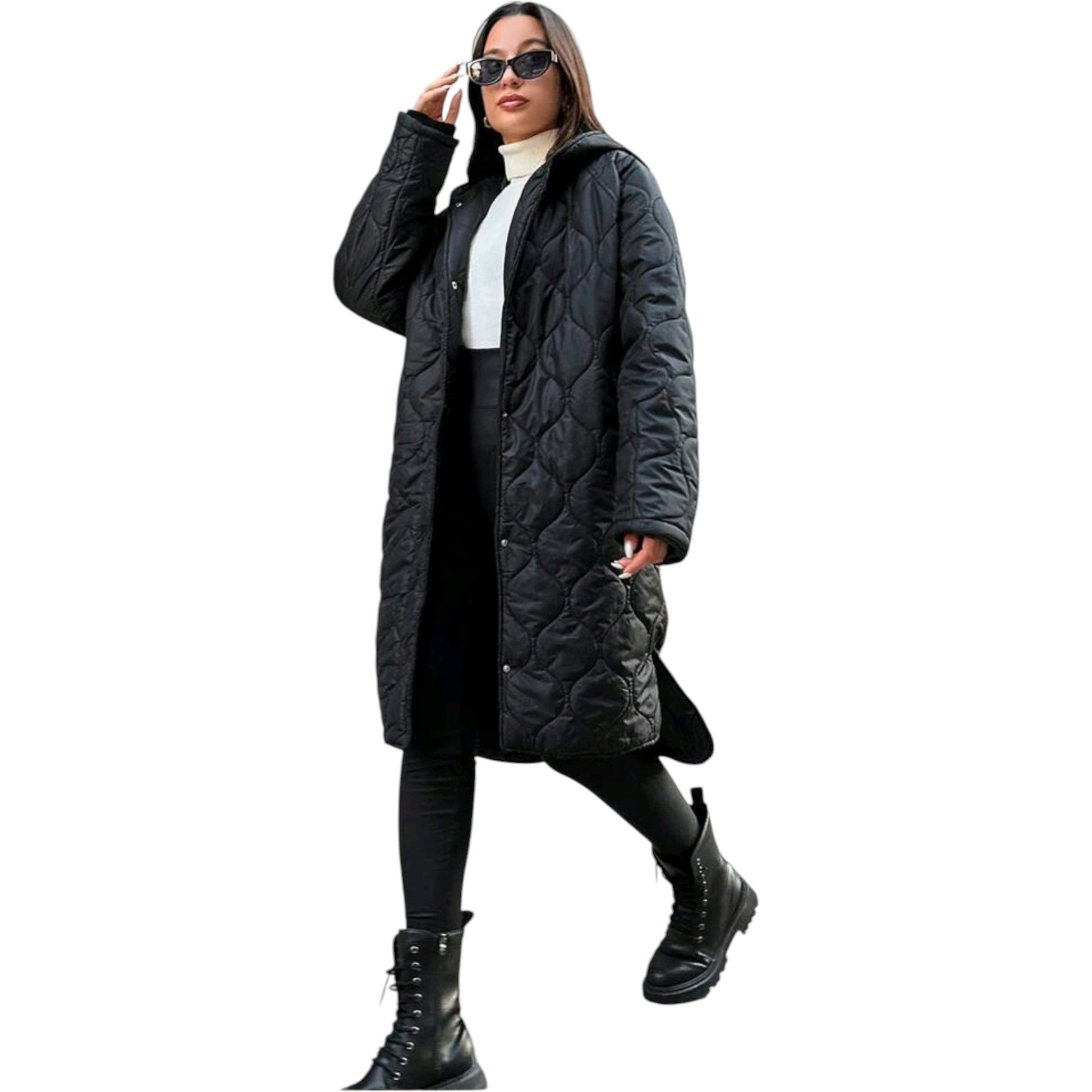 Címke nélküli, fekete, hosszú, steppelt kabát, kapucnival, elöl patentos záródással.