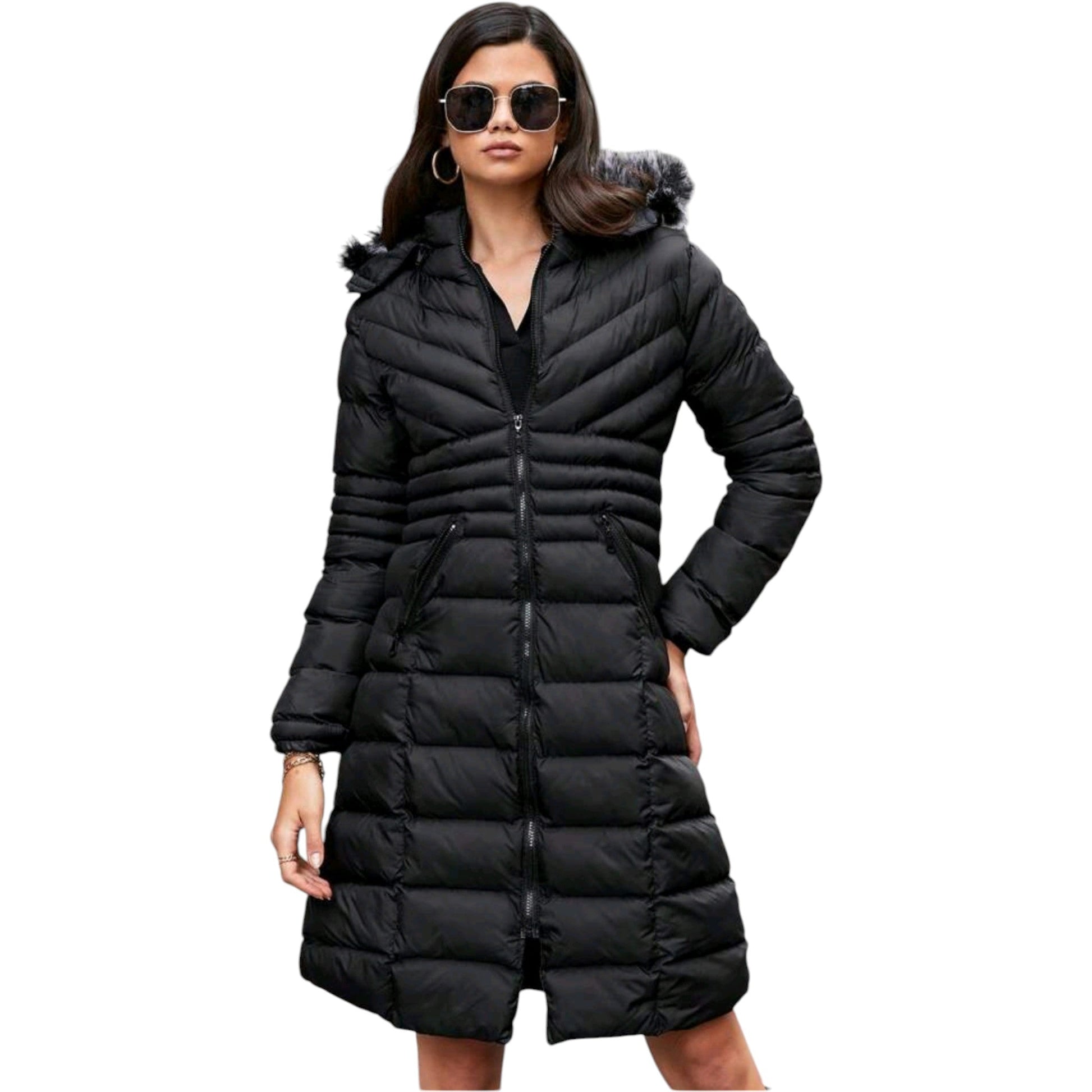 Címke nélküli, fekete, hosszú, steppelt téli kabát, cipzáras záródással, kapucnival, a kapucni szőrme (műszőrme) szegéllyel díszített, karcsúsított szabású.
