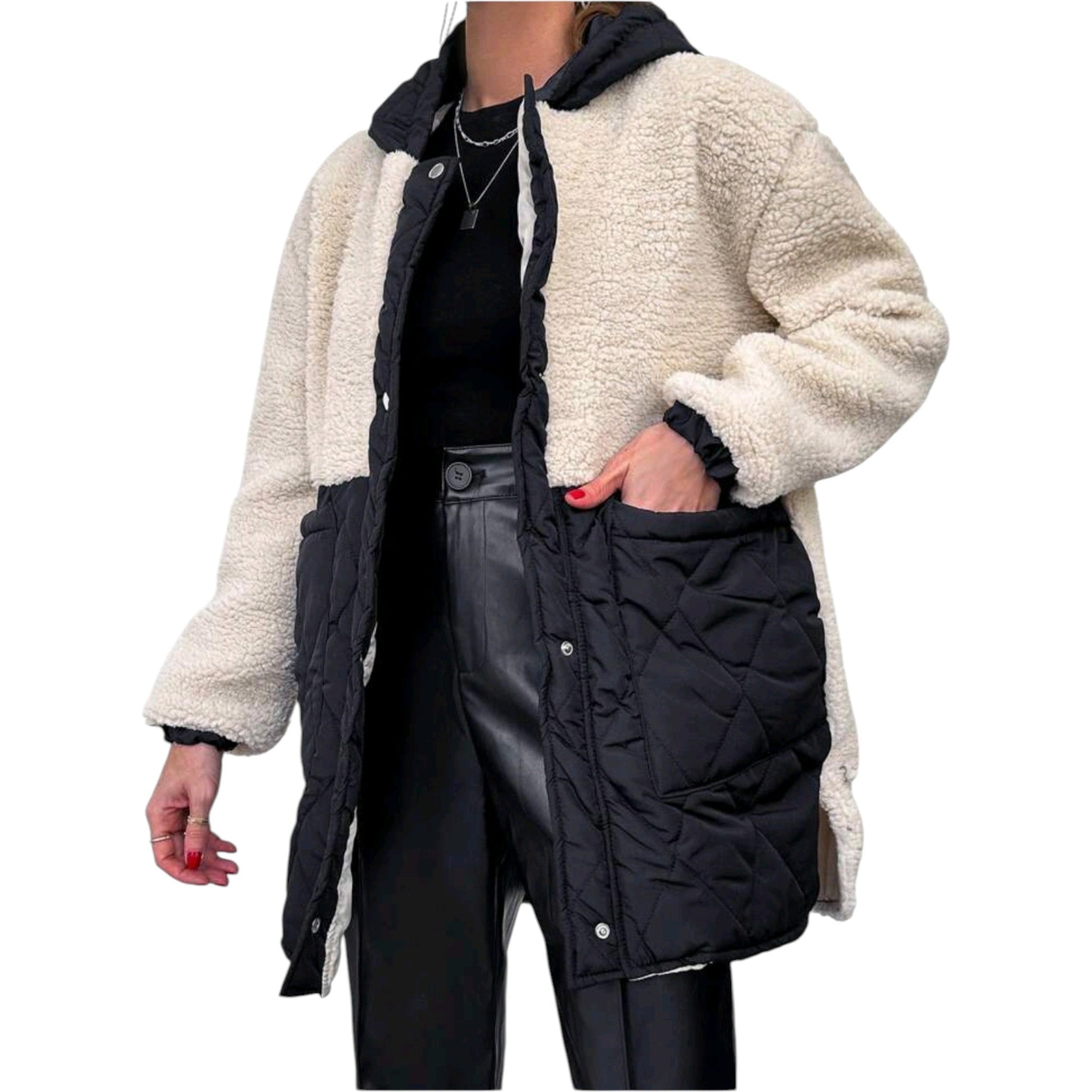 Címke nélküli, bézs/fekete, gyapjúhatású (teddy) anyagból készült téli kabát, elöl patentos záródással, nagy fekete steppelt zsebekkel és fekete steppelt kapucnival, hosszú ujjú.