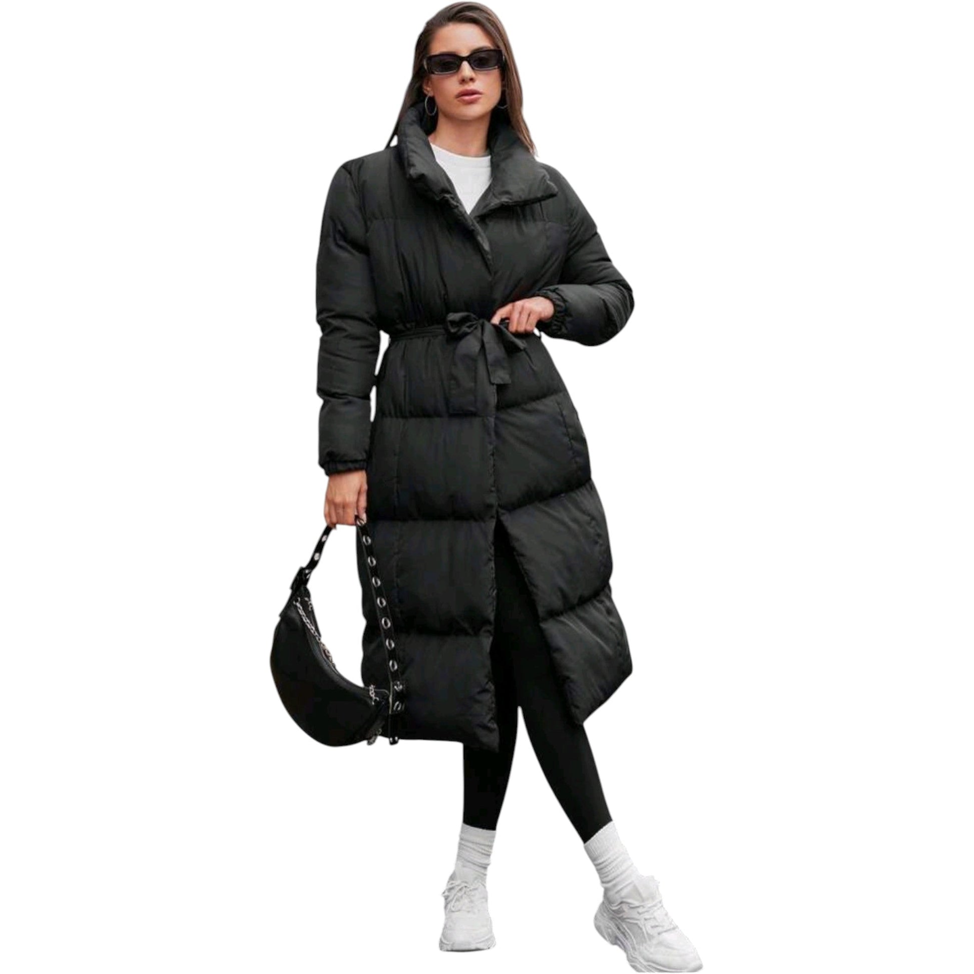 Címke nélküli, fekete, hosszú (térd alá érő), vastagon steppelt téli kabát, magas gallérral, elöl patentos és cipzáras záródással, megkötős derékkal (a ruhához nem jár öv).