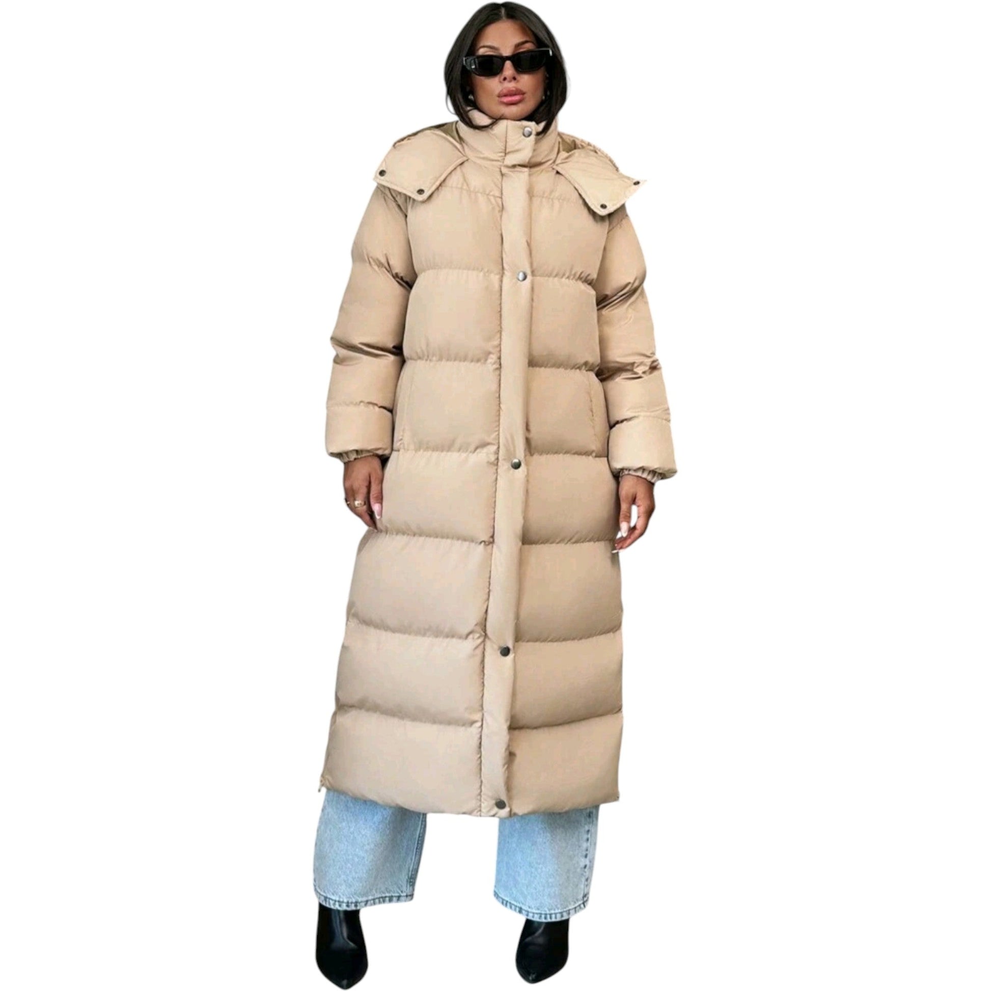 Címke nélküli, bézs, extra hosszú (bokáig érő), vastagon steppelt téli kabát, fix kapucnival, elöl patentos záródással, magas nyakkal.