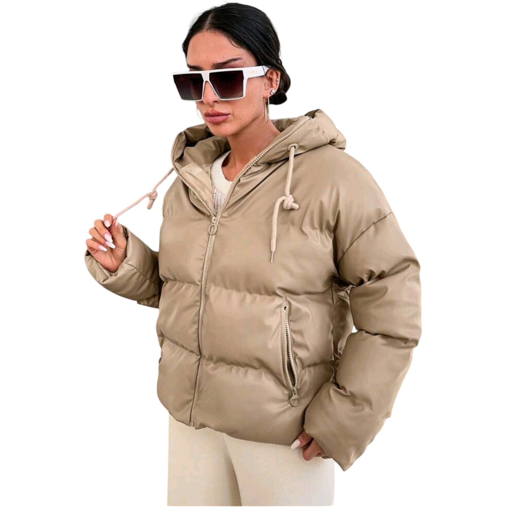 Címke nélküli, bézs, rövid, vastagon steppelt, matt bőr hatású/műbőr anyagú kabát, fix kapucnival, cipzáras záródással, húzózsinór a kapucnin.