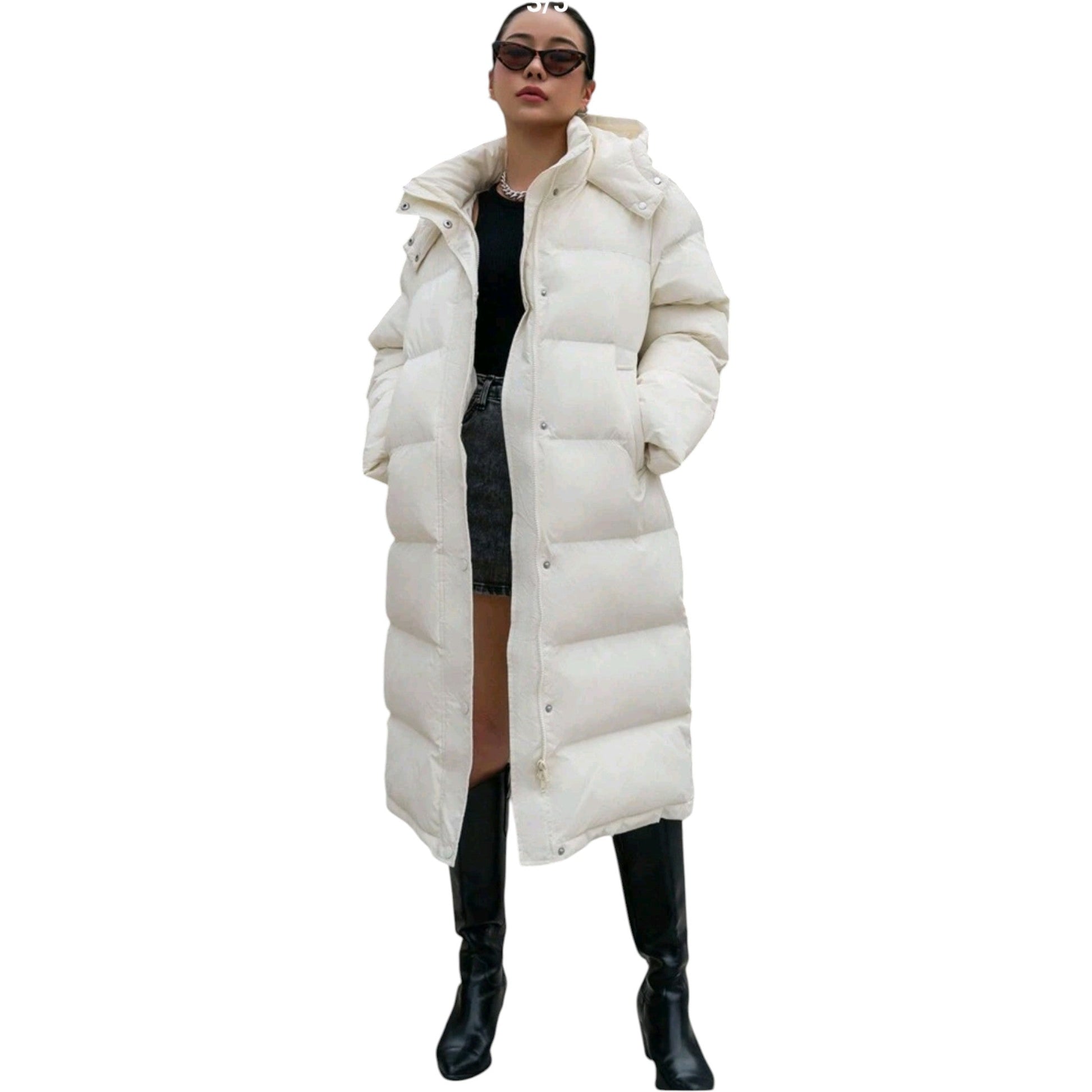 Címke nélküli, fehér, hosszú, levehető kapucnis, puffos steppelésű, magasított gallérú, végig patentos és cipzáras, hosszított szabású télikabát.