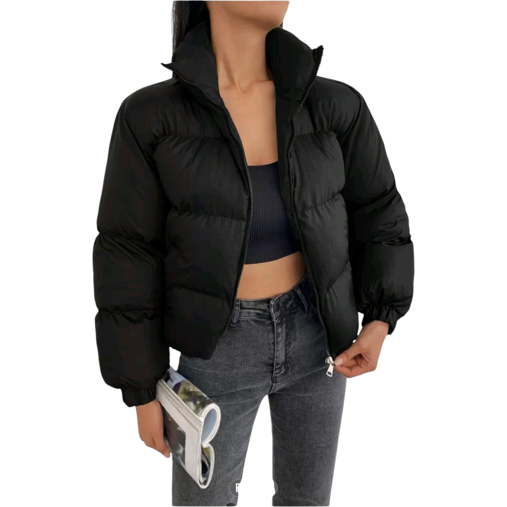 Címke nélküli, fekete, rövid, magas állógalléros, végig cipzáras, gumírozott ujjvégekkel, puffos steppelésű dzseki.